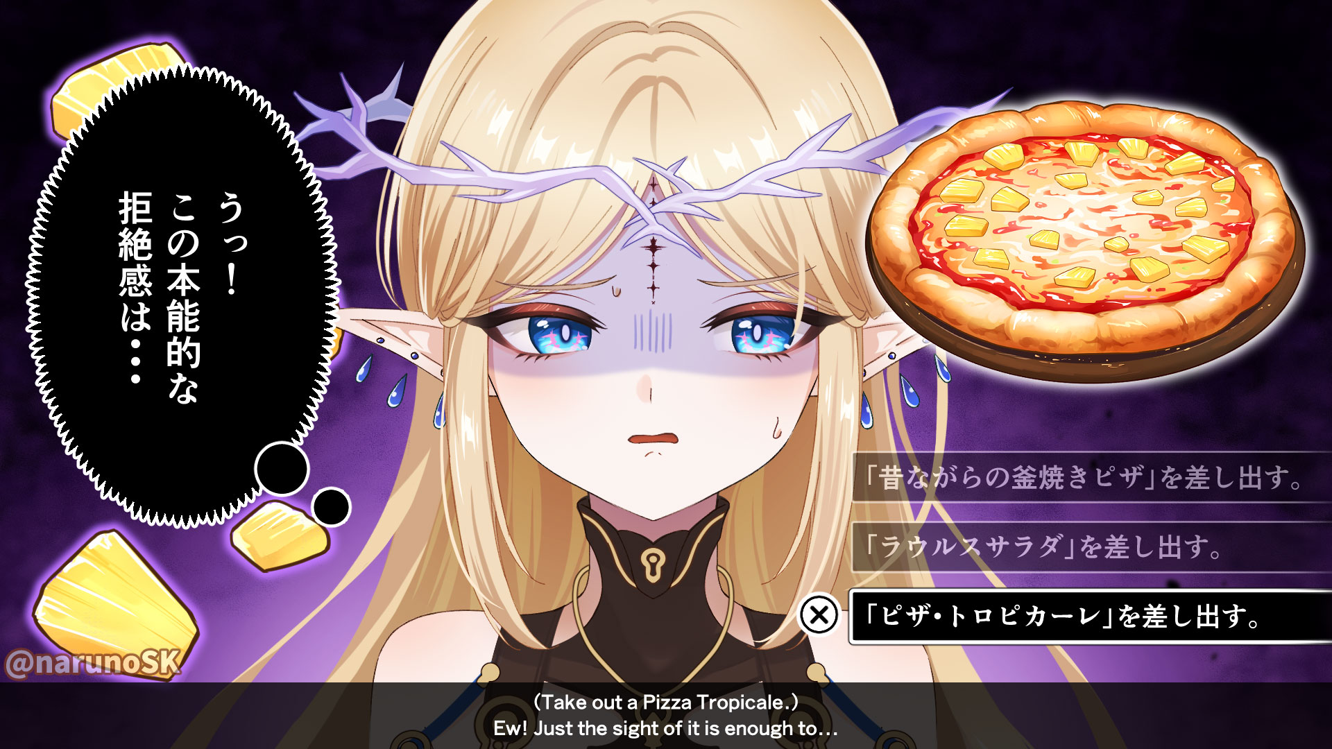 1girl blonde_hair blue_eyes canon_event cartethyia_(wuthering_waves) commentary commentary_request disgust earrings english_commentary highres jewelry long_hair mixed-language_commentary multiple_earrings naruno_suke_(narunosk) parted_bangs parted_lips pineapple_on_pizza pointy_ears portrait shaded_face solo sweatdrop tacet_mark_(wuthering_waves) wuthering_waves
