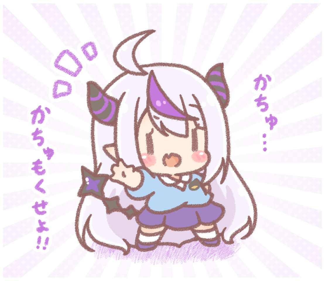 1girl :d ahoge blue_shirt blush_stickers chibi collared_shirt colored_shadow commentary_request demon_horns fang full_body grey_hair hololive horns kindergarten_uniform la+_darknesss long_hair long_sleeves looking_at_viewer mitarashi_neko multicolored_hair notice_lines open_mouth outstretched_arm pleated_skirt pointy_ears polka_dot polka_dot_background puffy_long_sleeves puffy_sleeves purple_hair purple_shoes purple_skirt shadow shirt shoes skirt smile socks solo standing streaked_hair sunburst sunburst_background translation_request very_long_hair virtual_youtuber white_socks |_|