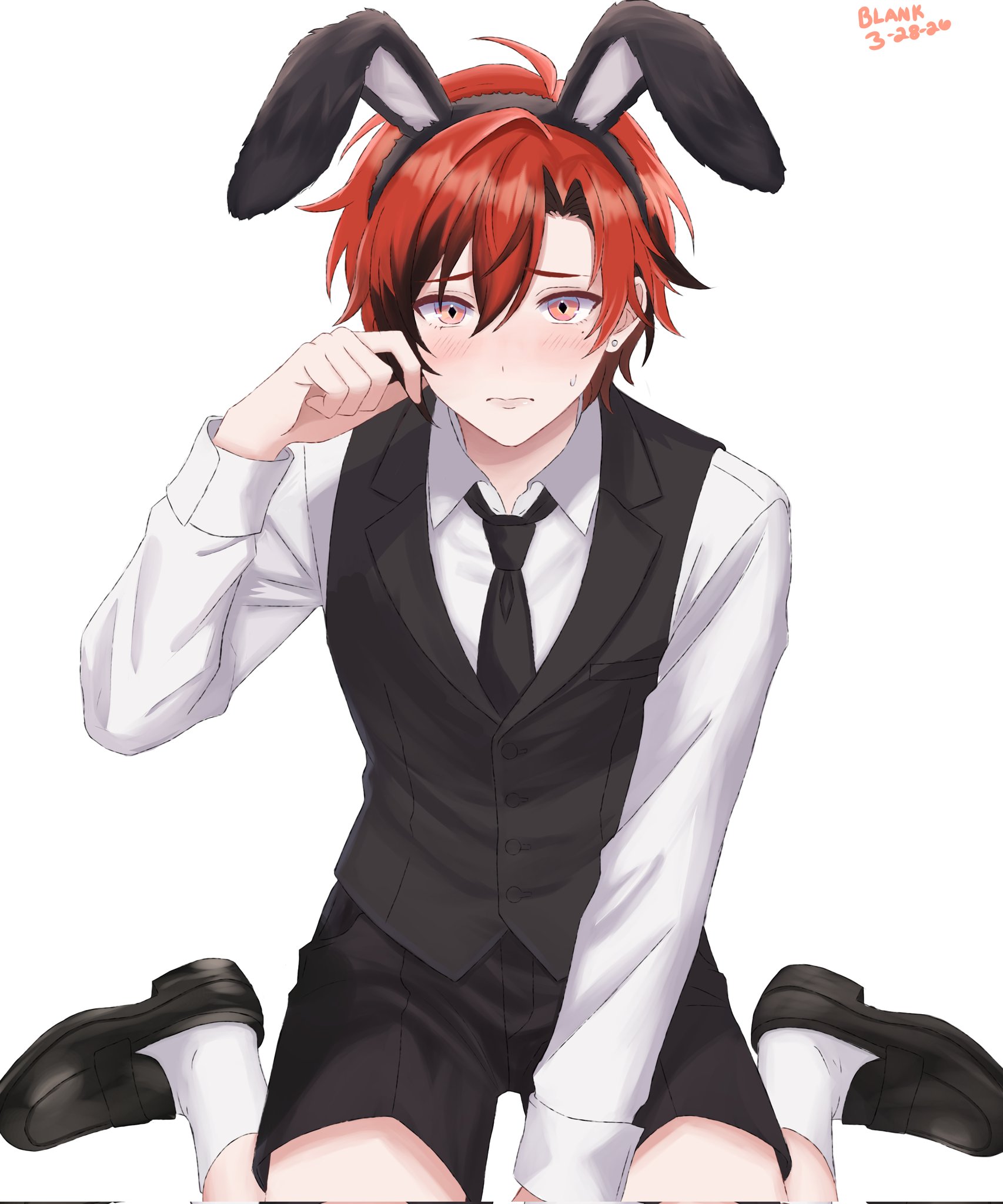 1boy alternate_costume animal_ears bishounen black_necktie black_shoes black_shorts black_vest blush closed_mouth collared_shirt commentary dated fake_animal_ears highres holostars holostars_english looking_at_viewer machina_x_flayon male_focus necktie rabbit_boy rabbit_ears red_eyes red_hair s1mple_merchant shirt shoes short_hair shorts sitting socks sweat untranslatable_commentary vest virtual_youtuber wariza white_shirt white_socks