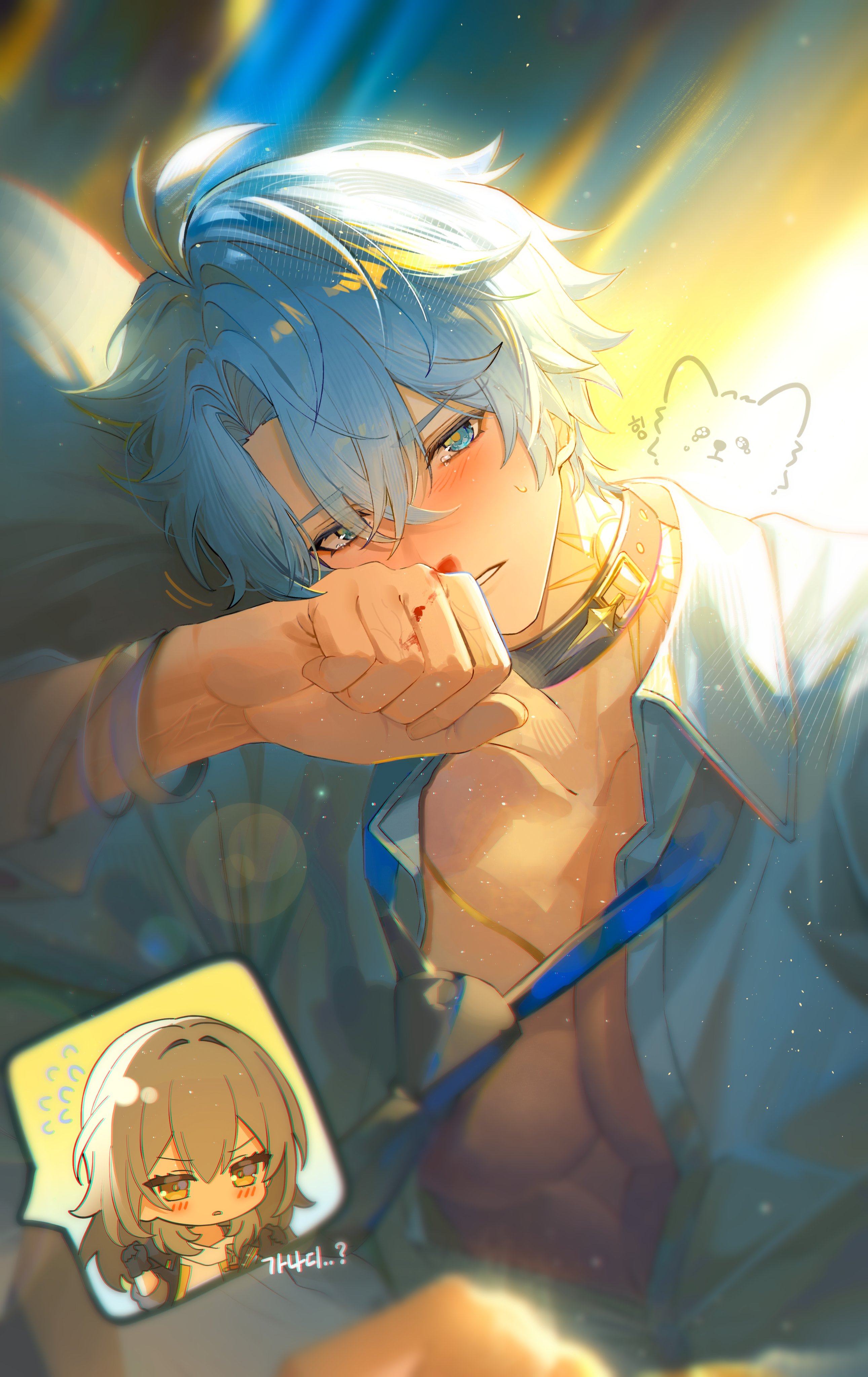 1boy 1girl absurdres ahoge blood blood_on_face blue_eyes blue_necktie blush chibi collar collarbone collared_shirt couple grey_hair hetero highres honkai:_star_rail honkai_(series) isobe47 looking_at_viewer male_focus necktie phainon_(honkai:_star_rail) samoyed_(dog) shirt short_hair stelle_(honkai:_star_rail) toned toned_male trailblazer_(honkai:_star_rail) white_hair white_shirt
