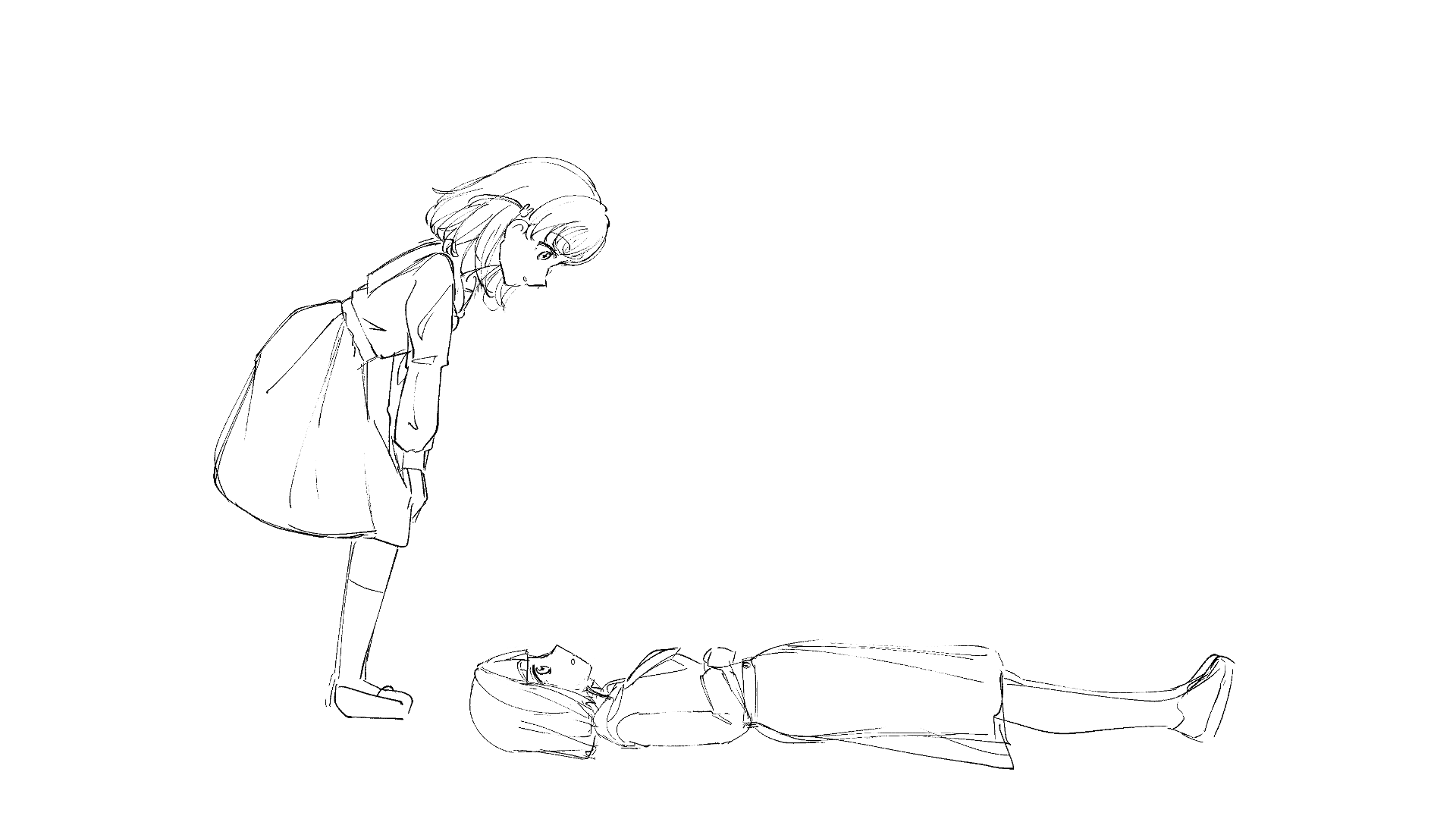 2girls cerise_bouquet commentary_request dress eye_contact full_body greyscale hair_ornament hands_on_own_knees hasu_no_sora_school_uniform highres hinoshita_kaho leaning_forward link!_like!_love_live! looking_at_another love_live! lying medium_dress medium_hair momose_ginko monochrome multiple_girls neckerchief on_back pleated_dress rabbit_hair_ornament sailor_collar sailor_dress school_uniform sen_yousoro simple_background standing two_side_up unfinished virtual_youtuber white_background winter_uniform