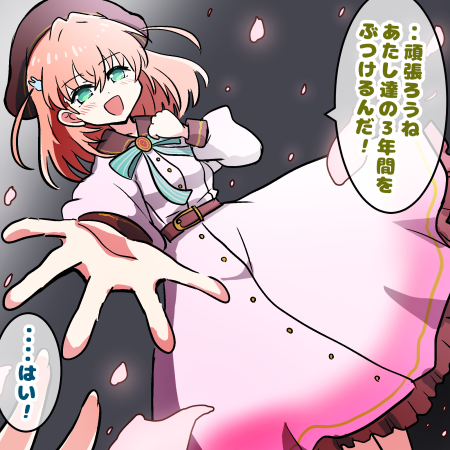 2girls aqua_eyes beret brown_hat dress feet_out_of_frame female_pov frilled_dress frills gradient_clothes gradient_dress green_ribbon grey_background hair_ornament hat hinoshita_kaho link!_like!_love_live! long_sleeves looking_at_viewer love_live! medium_dress medium_hair multiple_girls murano_sayaka navyblue_konjac neck_ribbon orange_hair pink_dress pov pov_hands rabbit_hair_ornament ribbon solo_focus translation_request two_side_up virtual_youtuber