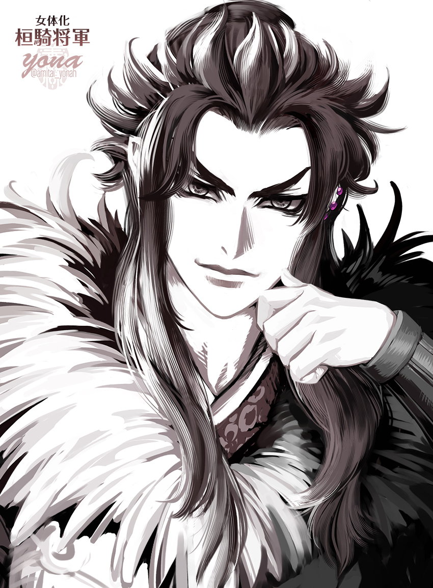 1boy closed_mouth commentary_request fur_trim furrowed_brow greyscale kanki_(kingdom) kingdom_(series) light_smile long_hair looking_at_viewer male_focus monochrome sidelocks simple_background solo translation_request v-shaped_eyebrows yona_(edenkasuga)