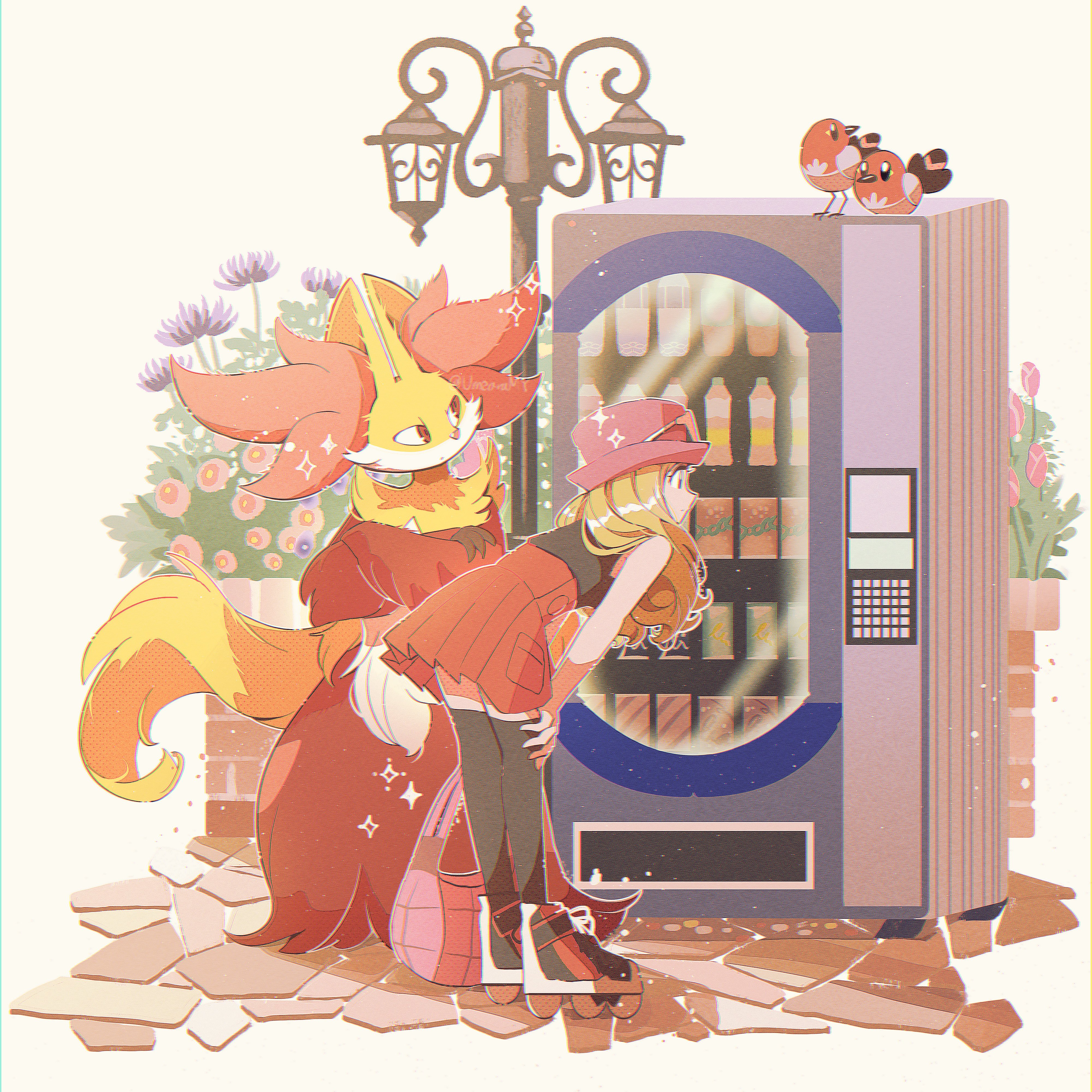 1girl 1other absurdres animal_ear_fluff animal_ears bird black_fur black_shirt black_thighhighs blonde_hair body_fur closed_mouth commentary delphox eyewear_on_headwear fletchling flower fox_ears fukkatsu_no_maya full_body furry gen_6_pokemon hat highres long_hair looking_at_object multicolored_fur nintendo pink_flower pink_hat pokemon pokemon_(creature) pokemon_x_and_y purple_flower red_eyes red_fur red_skirt roller_skates serena_(pokemon) shirt simple_background skates skirt sleeveless sleeveless_duster sleeveless_shirt snout standing thighhighs untranslatable_commentary vending_machine white-framed_eyewear white_background white_fur yellow_fur