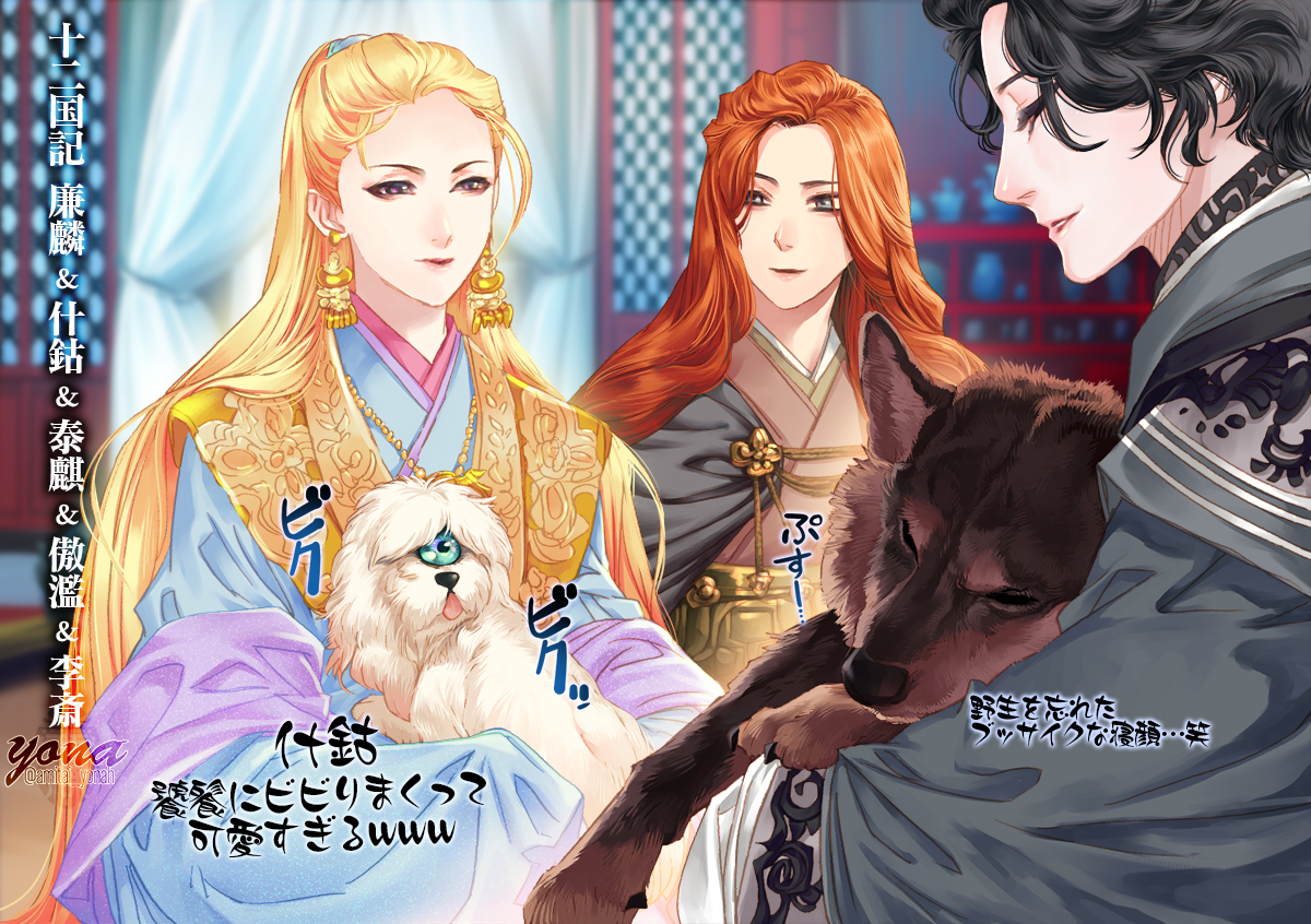 1boy 2girls animal black_hair blonde_hair closed_mouth commentary_request dog holding holding_animal holding_dog indoors juuni_kokuki multiple_girls nakajima_youko one-eyed orange_hair renrin_(juuni_kokuki) short_hair taiki_(juuni_kokuki) tongue tongue_out translation_request white_dog yona_(edenkasuga)