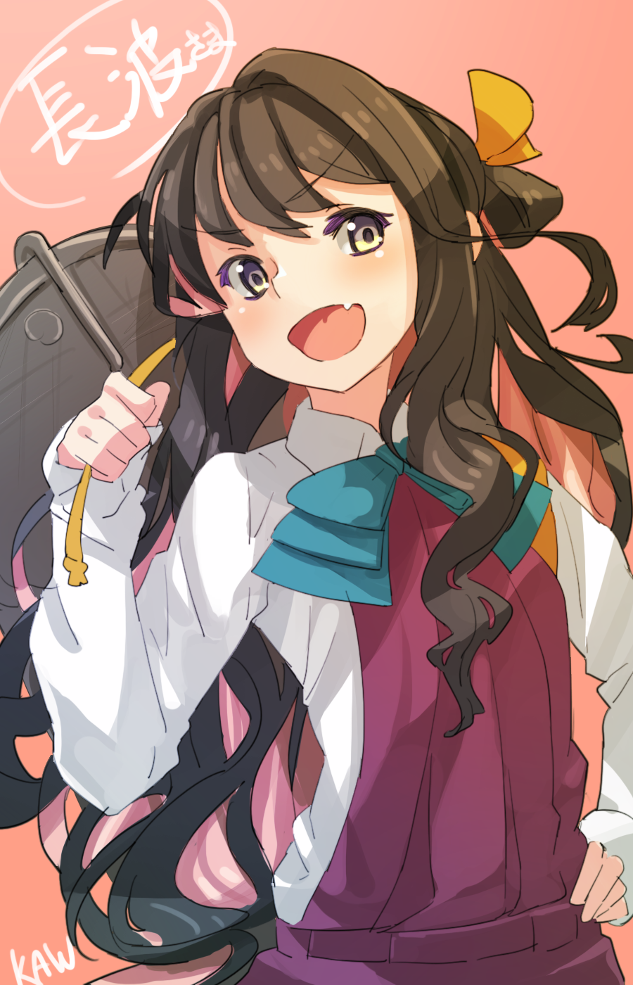 1girl black_hair blush character_name collared_shirt commentary_request dress drum_(container) fang hair_between_eyes hair_ribbon hand_on_own_hip highres holding kantai_collection kaw194 long_hair long_sleeves looking_at_viewer multicolored_hair naganami_(kancolle) one-hour_drawing_challenge open_mouth pink_background pink_hair purple_dress ribbon shirt simple_background sleeveless sleeveless_dress sleeves_past_wrists solo very_long_hair wavy_hair white_shirt yellow_eyes