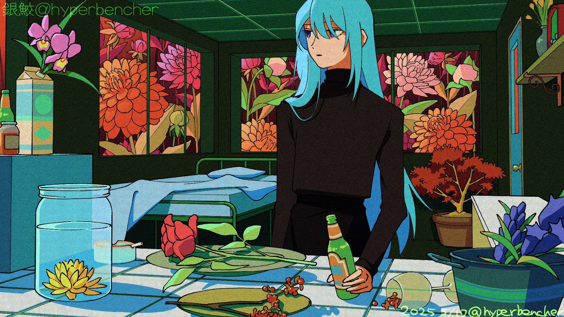 1girl aqua_hair artist_name bed black_sweater blanket blue_eyes bottle cigarette commentary_request cooking_pot cup dated drink_carton drinking_glass film_grain flower glass_jar highres holding holding_bottle hyperbencher indoors long_hair long_sleeves looking_to_the_side original parted_lips pillow pink_flower plant plate potted_plant red_flower red_rose rose shelf solo standing straight_hair sweater turtleneck turtleneck_sweater very_long_hair window wine_glass