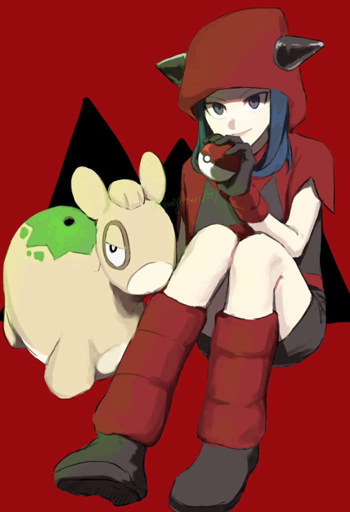 1girl black_gloves black_shoes black_shorts blue_eyes blue_hair closed_mouth commentary fake_horns gen_3_pokemon gloves hood hood_up hooded_vest hoodie horns leg_warmers looking_ahead mikan34 nintendo numel pokemon pokemon_(creature) pokemon_ruby/sapphire/emerald red_background red_leg_warmers red_vest shoes shorts sidelocks team_magma team_magma_grunt team_magma_uniform vest