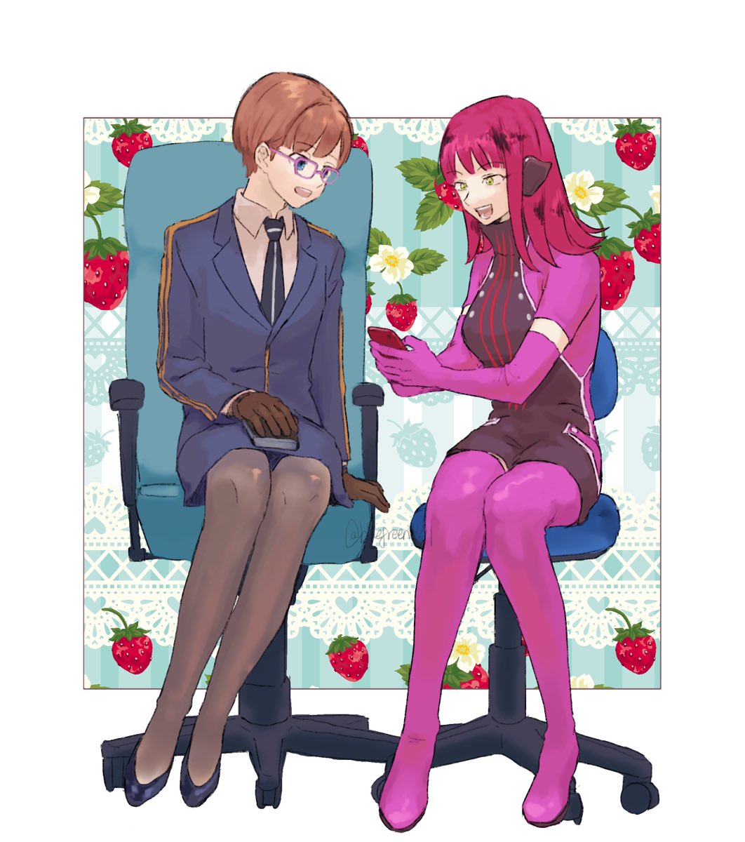 2girls black_necktie black_shoes blue_background blue_eyes blue_jacket blue_skirt bob_cut book boots border_operator_uniform_(world_trigger) breasts brown_gloves brown_hair brown_pantyhose chair collared_shirt commentary dress_shirt food fruit glasses gloves headphones highres holding holding_book holding_phone jacket katori_squad's_uniform katori_youko large_breasts long_hair long_sleeves mikan34 multiple_girls necktie office_chair open_mouth pantyhose pencil_skirt phone purple-framed_eyewear purple_boots purple_gloves purple_jacket red_hair shirt shoes short_hair short_sleeves showing_phone sitting skirt smile somei_hana strawberry swivel_chair thigh_boots untranslatable_commentary white_background white_shirt world_trigger yellow_eyes