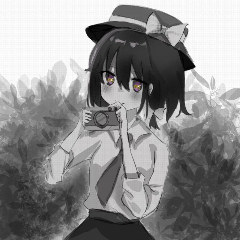 2girls black_hair black_hat black_skirt blush bow camera chinese_commentary closed_mouth collared_shirt commentary hair_bow hat hat_bow holding holding_camera leaf maribel_hearn monochrome_background multiple_girls plant shirt shirt_tucked_in short_hair skirt sleeves_rolled_up smile solo_focus touhou usami_renko white_bow white_shirt yogurtkoii