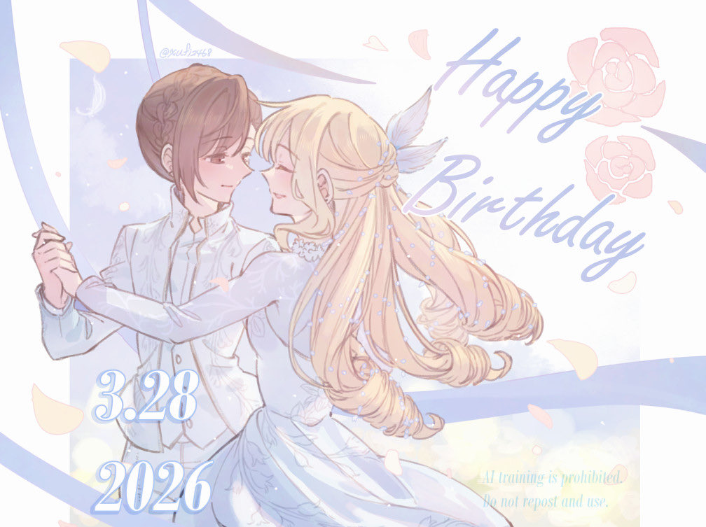 2girls blonde_hair brown_hair claire_francois dancing dress english_text formal_clothes happy_birthday holding_hands long_hair multiple_girls rae_taylor short_hair suit watashi_no_oshi_wa_akuyaku_reijou white_dress white_suit wife_and_wife xufi2468 yuri