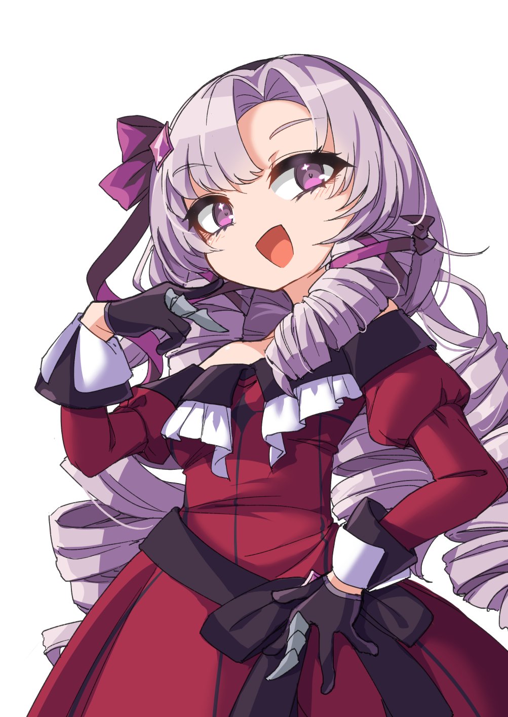 1girl bare_shoulders black_gloves claw_ring commentary_request curtained_hair dress drill_hair drill_sidelocks eyelashes fun_bo gloves hair_ribbon hand_on_own_hip hand_up highres hyakumantenbara_salome hyakumantenbara_salome_(1st_costume) juliet_sleeves long_hair long_sleeves nijisanji off-shoulder_dress off_shoulder open_mouth puffy_sleeves purple_eyes purple_hair purple_ribbon red_dress ribbon sidelocks simple_background smile solo virtual_youtuber waist_ribbon white_background