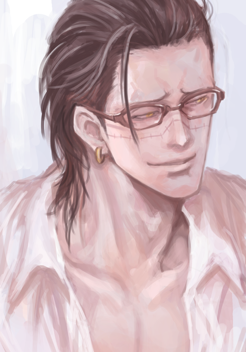 1boy arisue_kanako black_hair collarbone commentary_request crocodile_(one_piece) earrings glasses jewelry male_focus mature_male one_piece portrait shirt short_hair sideburns simple_background stitched_face stitches white_shirt yellow_eyes