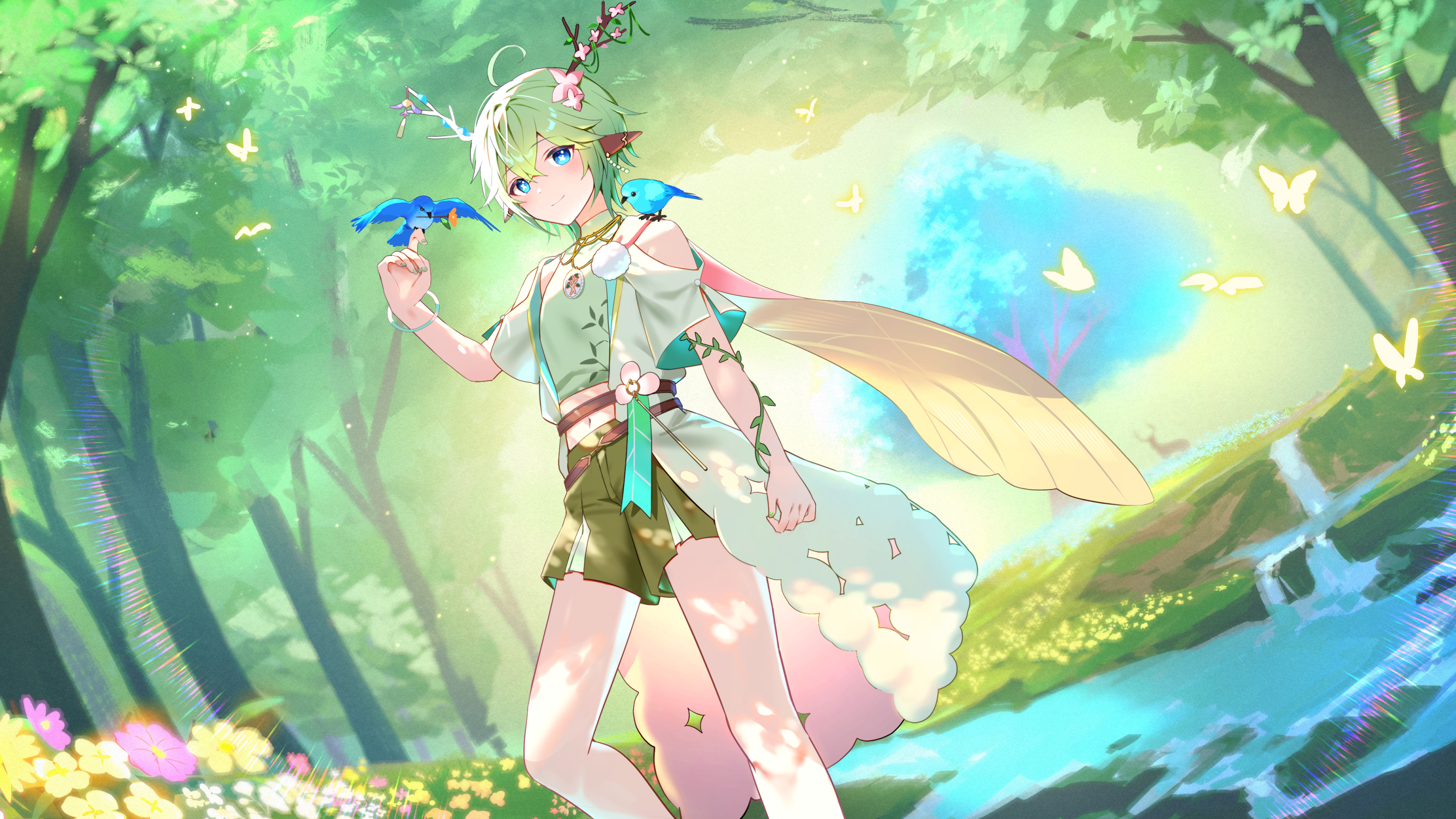 1boy animal animal_on_shoulder antlers azna bare_shoulders bird bird_on_hand bird_on_shoulder blue_bird blue_eyes brown_shorts bug butterfly clothing_cutout commentary_request commission cropped_shirt flower forest green_hair hair_flower hair_ornament highres horns indie_virtual_youtuber insect jacket looking_at_viewer nature navel open_clothes open_jacket outdoors pink_flower pointy_ears shirt short_hair shorts shoulder_cutout skeb_commission solo syphu_(vtuber) tree virtual_youtuber water white_jacket white_shirt yellow_flower