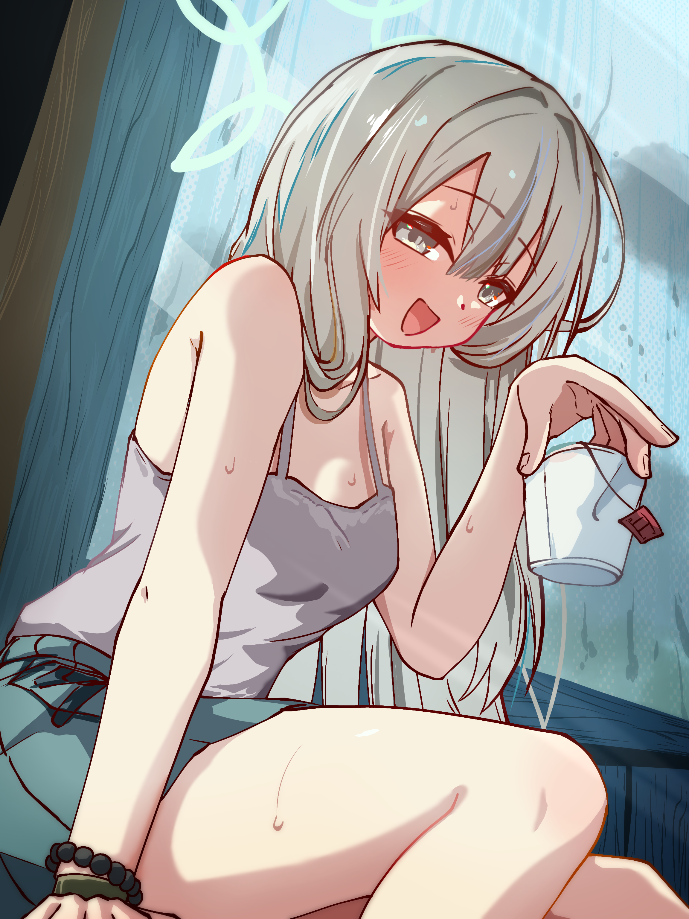 1girl absurdres bare_shoulders blue_archive breasts camisole commentary cup disposable_cup glass green_halo green_skirt grey_eyes grey_hair halo highres holding holding_cup konoka_(blue_archive) long_hair looking_at_viewer open_mouth purple_camisole rain reisaki_niseen sitting skirt small_breasts smile solo water_drop wet