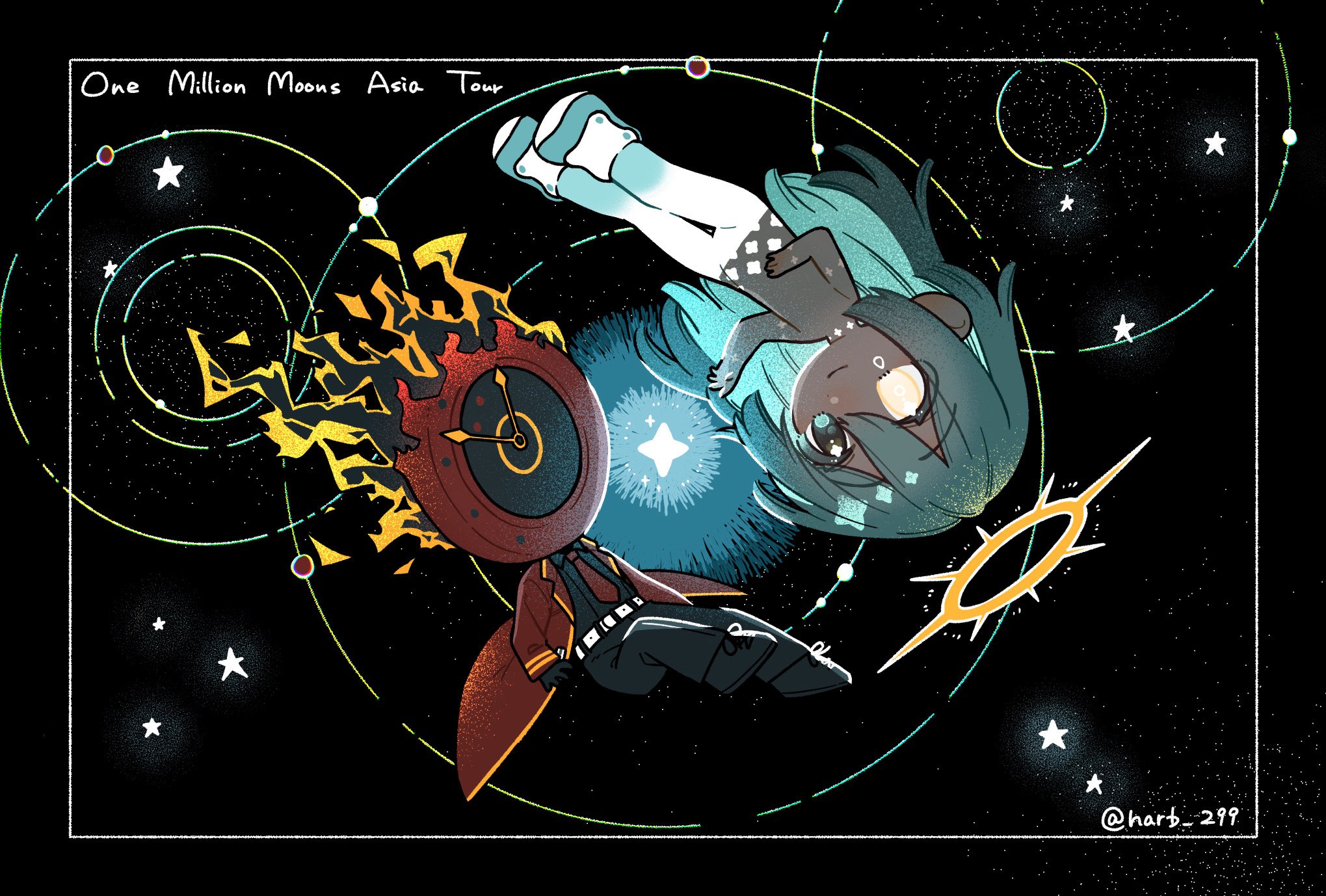2others belt black_background black_pants black_shirt chibi chibi_only clock closed_mouth coat collared_shirt commentary_request dante_(limbus_company) english_text fire glowing halo harb_299 heterochromia highres inset_border limbus_company long_hair mili_(band) multiple_others necktie object_head open_clothes open_coat pants project_moon red_coat red_necktie rotational_symmetry shirt shoes sky smile star_(sky) star_(symbol) star_trail starry_sky topless_other torino_(mili) twitter_username white_belt