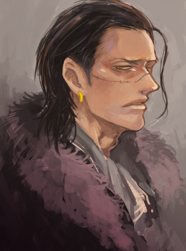 1boy adam's_apple arisue_kanako ascot black_hair commentary_request crocodile_(one_piece) earrings grey_background jewelry looking_at_viewer male_focus one_piece parted_lips portrait short_hair sideburns stitched_face stitches upper_body white_ascot