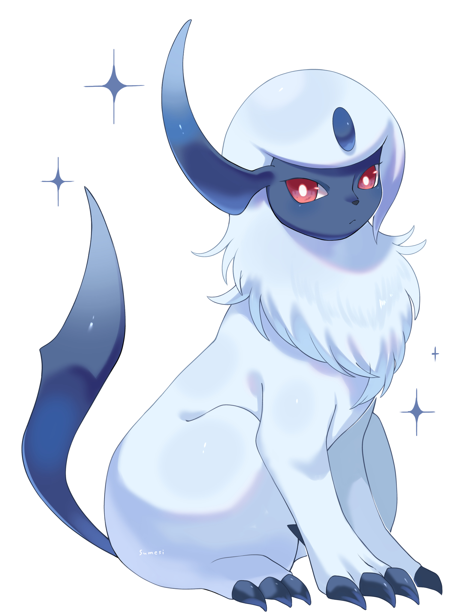 absol artist_name bright_pupils claws closed_mouth commentary_request full_body gen_3_pokemon highres iwasi_29 nintendo no_humans pokemon pokemon_(creature) pokemon_focus red_eyes simple_background solo sparkle white_background white_pupils