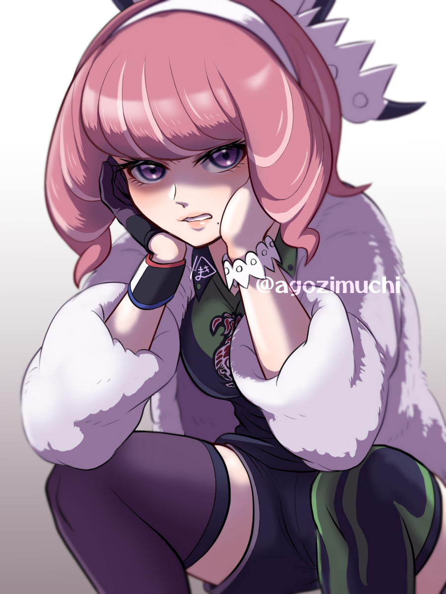 1girl bow bracelet breasts chimaki_(agozimuchi) collared_shirt commentary_request drill_hair drill_sidelocks dynamax_band eyeshadow flipped_hair fur_jacket hair_bow hairband head_rest highres jacket jewelry klara_(pokemon) makeup medium_breasts mole mole_under_mouth multicolored_thighhighs nintendo pink_eyeshadow pink_hair pink_lips pokemon pokemon_sword_and_shield print_shirt print_shorts purple_eyes shirt short_hair shorts side_slit side_slit_shorts sidelocks solo squatting teeth two-tone_shirt two-tone_shorts two-tone_thighhighs white_bow white_hairband