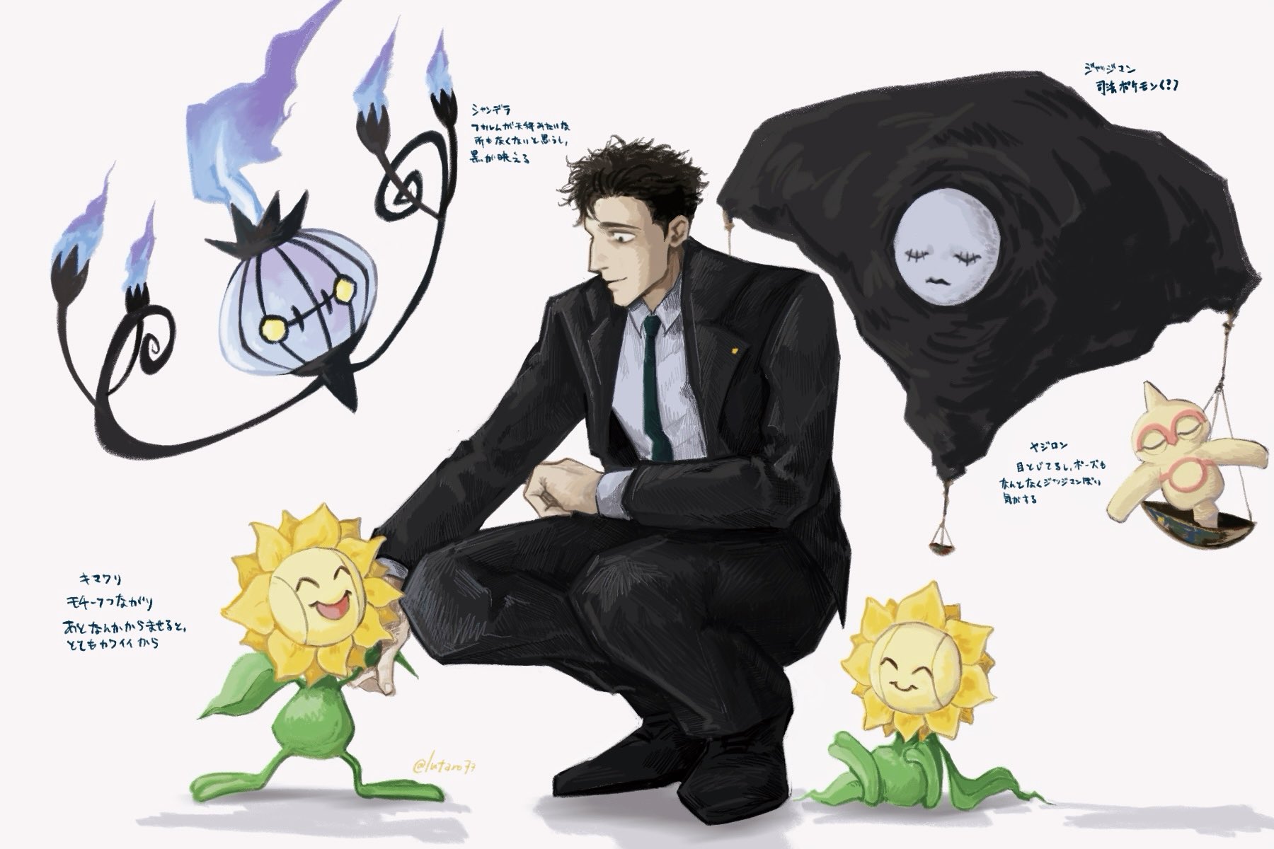 1boy black_hair black_pants chandelier chandelure closed_eyes closed_mouth commentary_request fire formal_clothes gen_2_pokemon gen_5_pokemon highres higuruma_hiromi jacket jujutsu_kaisen lutaro77 necktie nintendo pants pokemon pokemon_(creature) purple_fire simple_background smile suit suit_jacket sunflora white_background yellow_eyes