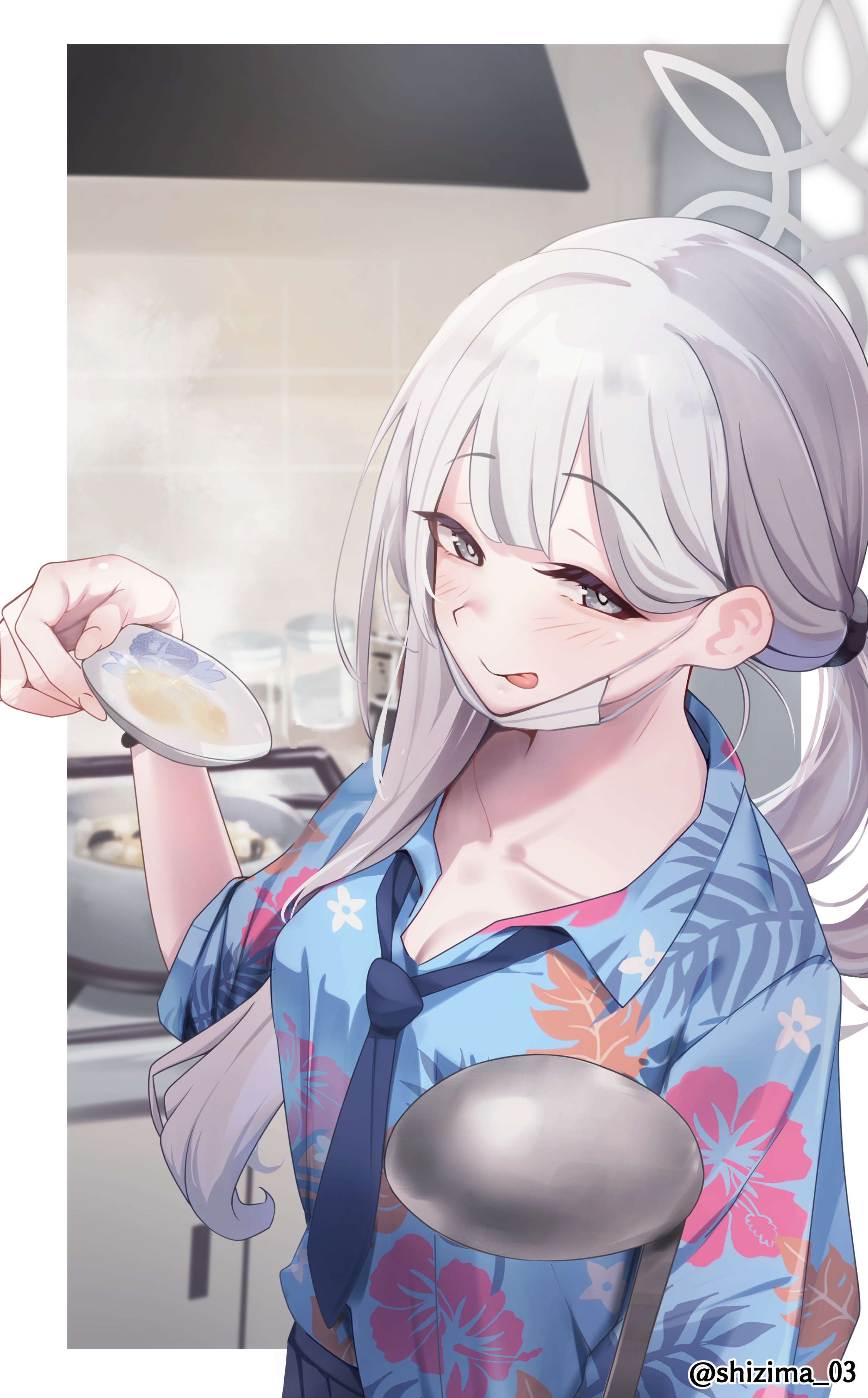 1girl absurdres alternate_hairstyle artist_name blue_archive blue_necktie blue_shirt blurry blurry_background border bowl bright_pupils closed_mouth commentary_request cooking_pot floral_print_shirt food grey_eyes grey_hair grey_halo halo hawaiian_shirt highres holding holding_bowl indoors kitchen konoka_(blue_archive) ladle long_hair looking_at_viewer loose_necktie low_ponytail mask mask_pull mouth_mask necktie open_collar outside_border ponytail shijima_(shizima_03) shirt smile solo surgical_mask tongue tongue_out twitter_username upper_body white_border white_mask white_pupils