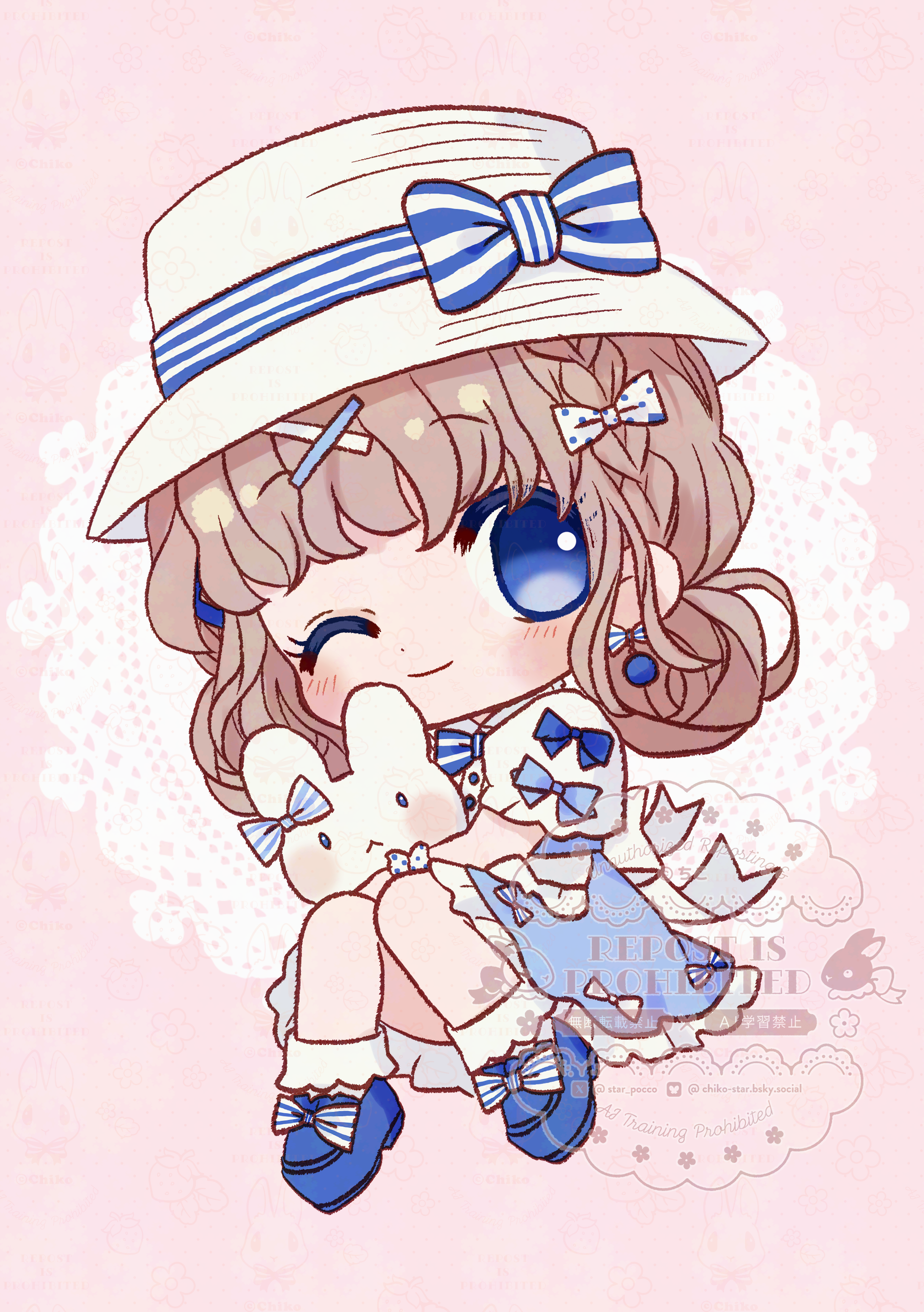 1girl ;) absurdres blue_bow blue_bowtie blue_dress blue_eyes blue_shoes blush bobby_socks bow bowtie brown_hair chibi chibi_only chiko_(star_pocco) closed_mouth commentary_request dot_nose dress footwear_bow frilled_dress frills full_body hair_ornament hat hat_bow highres holding holding_stuffed_toy long_hair looking_at_viewer one_eye_closed original pink_background shoes short_sleeves sleeve_bow smile socks solo striped_bow striped_bowtie striped_clothes stuffed_animal stuffed_rabbit stuffed_toy watermark white_hat white_socks x_hair_ornament