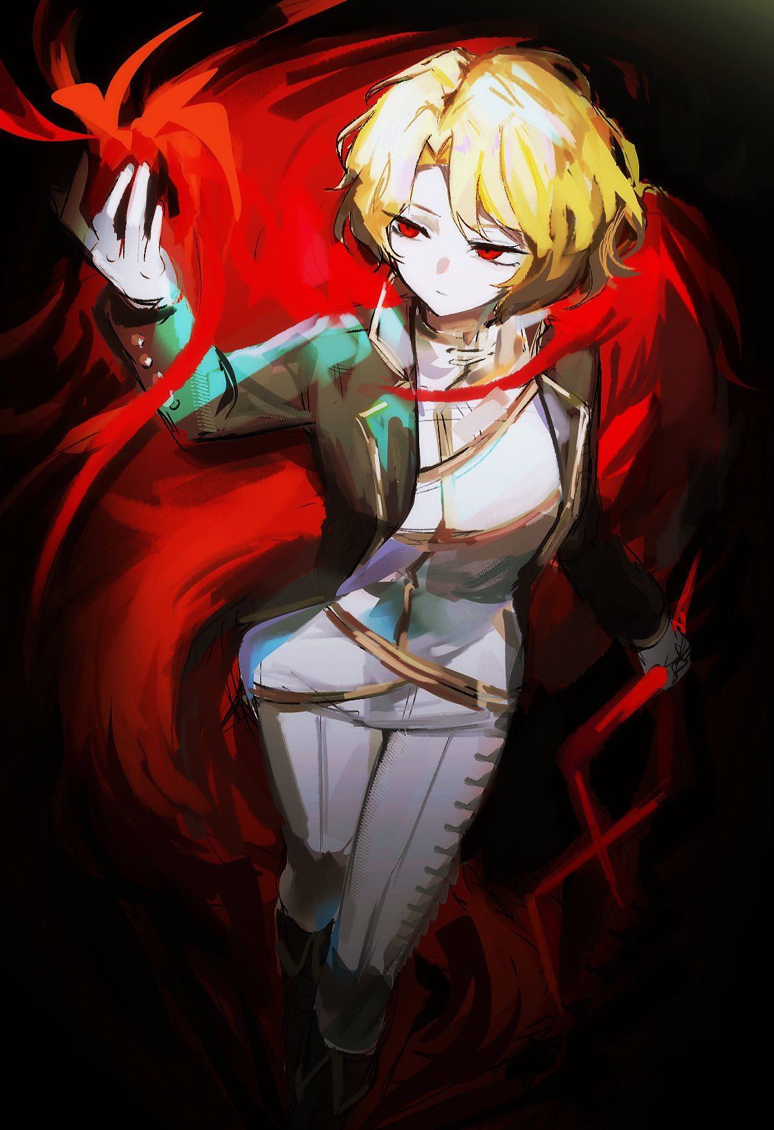 1girl black_coat blonde_hair coat collared_shirt commentary_request don_quixote_(project_moon) feathers highres jacket korean_commentary limbus_company long_sleeves n00xx2 pants parted_bangs project_moon red_eyes red_feathers red_fur sancho_(project_moon) shirt short_hair solo white_shirt