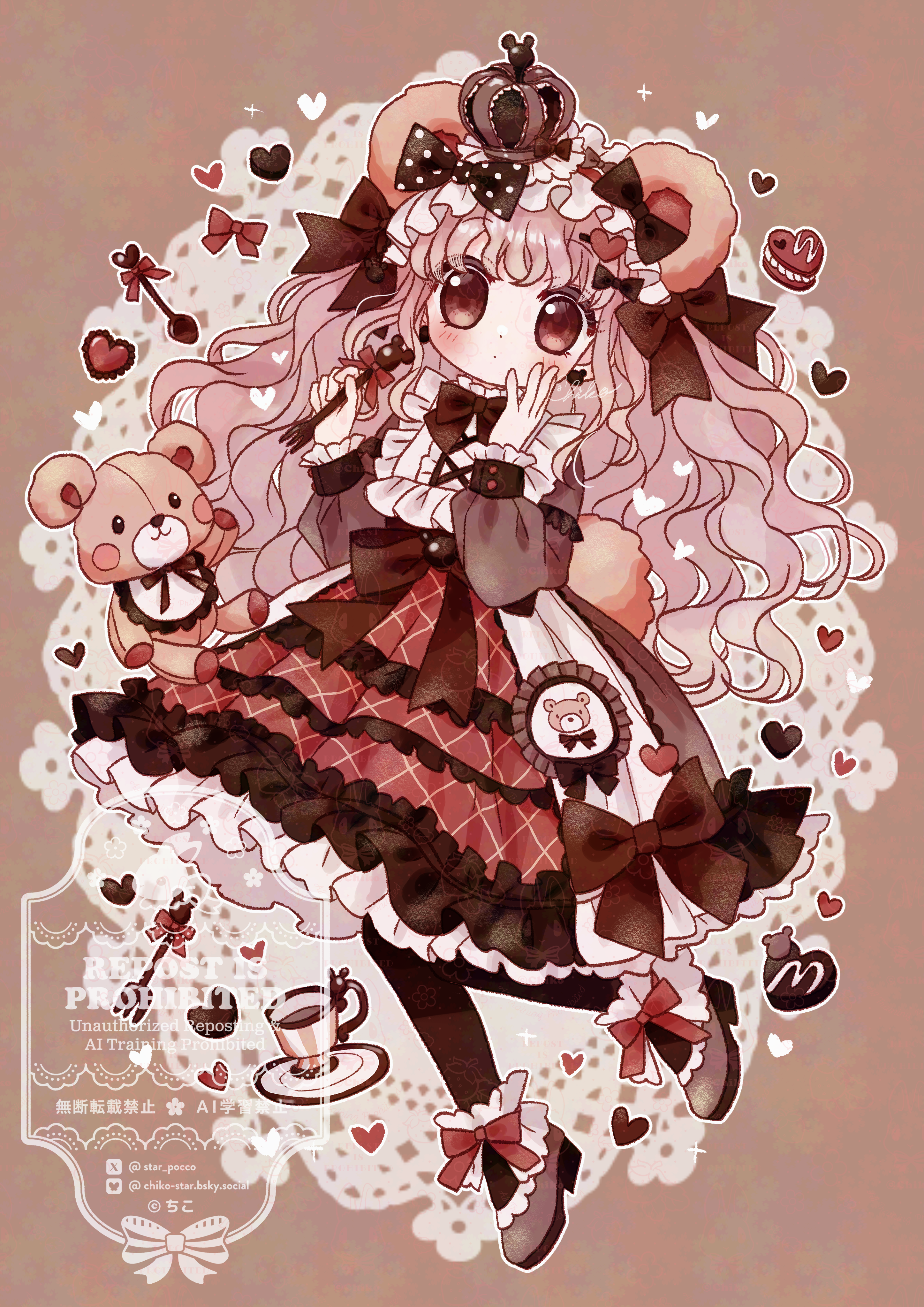1girl absurdres animal_ears bear_ears bear_girl bear_tail black_pantyhose blush bow bowtie brown_bow brown_bowtie brown_eyes brown_shirt brown_shoes chiko_(star_pocco) closed_mouth commentary_request crown dot_nose fork frilled_skirt frilled_sleeves frills full_body hand_up hands_up heart highres holding holding_fork long_hair long_sleeves looking_at_viewer original outline pantyhose pink_hair red_skirt shirt shoes skirt solo standing stuffed_animal stuffed_toy tail teddy_bear waist_bow watermark white_outline