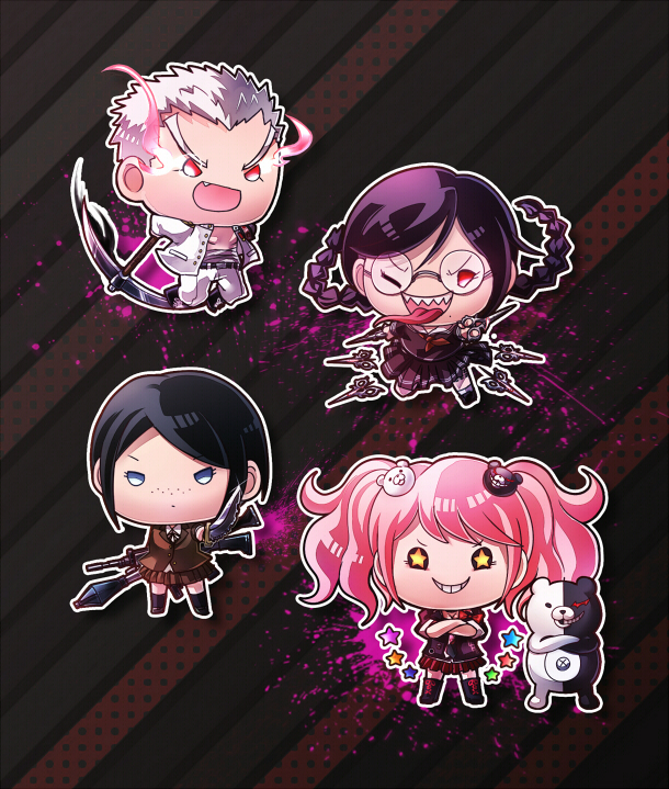 1boy 3girls blood braid chibi chibi_only commentary_request danganronpa:_trigger_happy_havoc danganronpa_(series) enoshima_junko fukawa_toko genocider_sho ikusaba_mukuro ishida_(danganronpa) kayako_(bimabima) monokuma multiple_girls pickaxe pink_blood school_uniform scissors star_(symbol) twin_braids twintails