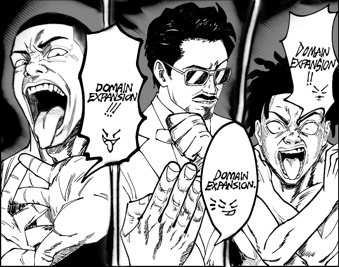 3boys buzz_cut commentary domain_expansion dreadlocks english_commentary english_text facial_hair flightreacts goatee greyscale grin half-closed_eyes hands_up interlocked_fingers ishowspeed jujutsu_kaisen lh4yde looking_at_viewer male_focus marvel meme monochrome multiple_boys mustache open_mouth own_hands_together portrait real_life scene_reference short_hair smile speech_bubble straight-on sunglasses tongue tongue_out tony_stark triple_domain_expansion_(meme) very_short_hair wide-eyed x_arms