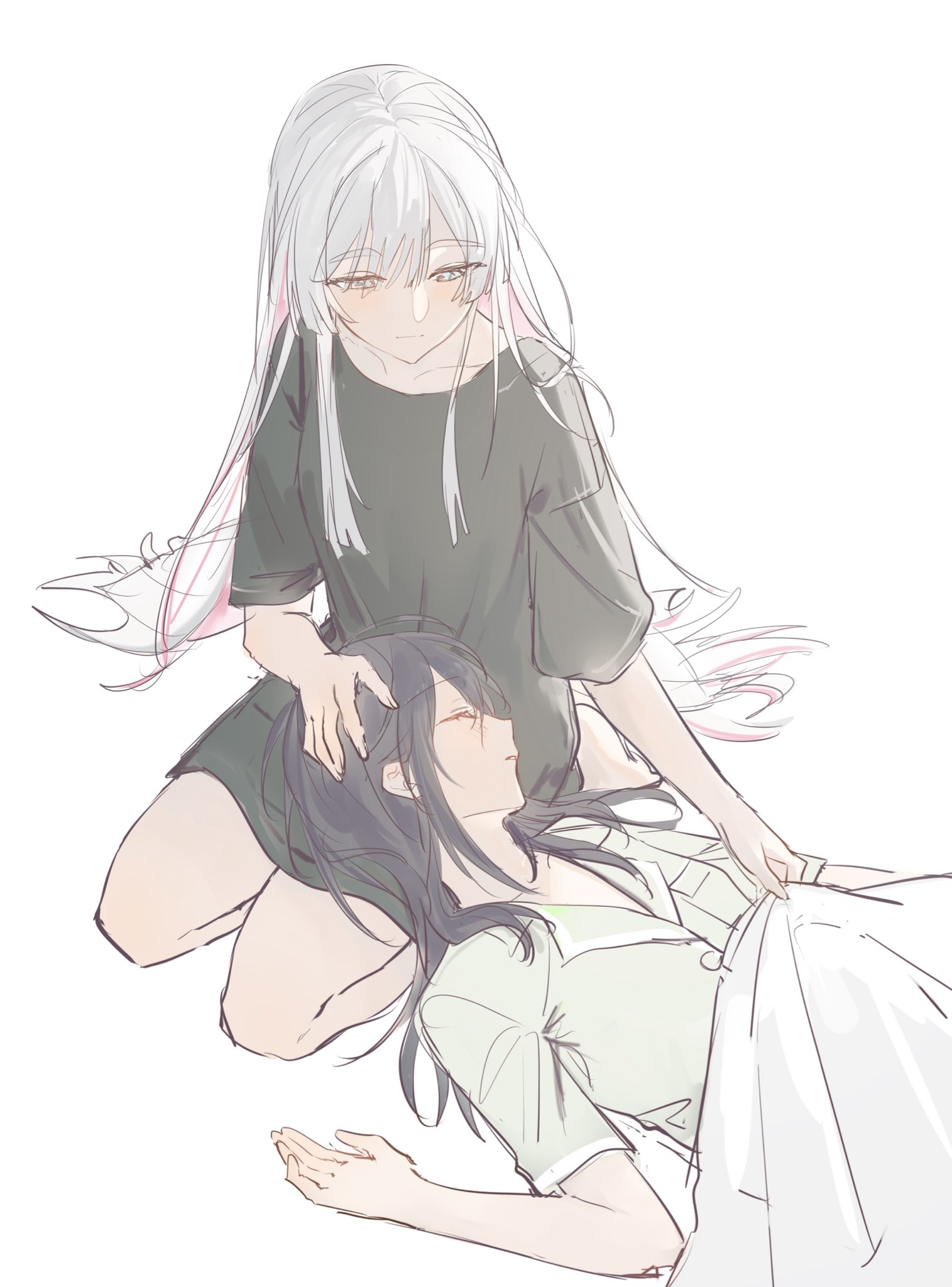 2girls black_hair black_shirt blush cho_kaguya-hime! closed_eyes closed_mouth commentary genkounikki01 green_shirt hand_on_another's_head highres lap_pillow long_hair multiple_girls open_mouth pajamas runami_yachiyo sakayori_iroha shirt short_sleeves sidelocks simple_background sitting three-quarter_sleeves white_background white_hair yuri