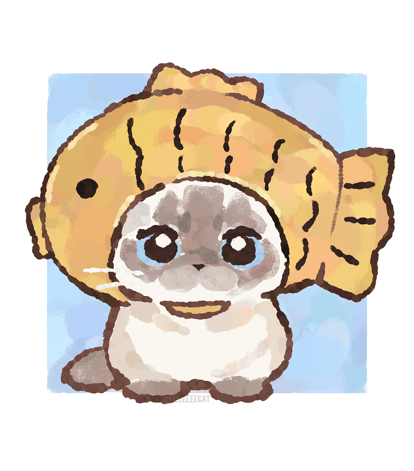animal animal_focus blue_background blue_eyes border cat fish food_costume full_body gentlecat grey_cat highres no_humans original outside_border simple_background solo whiskers white_border