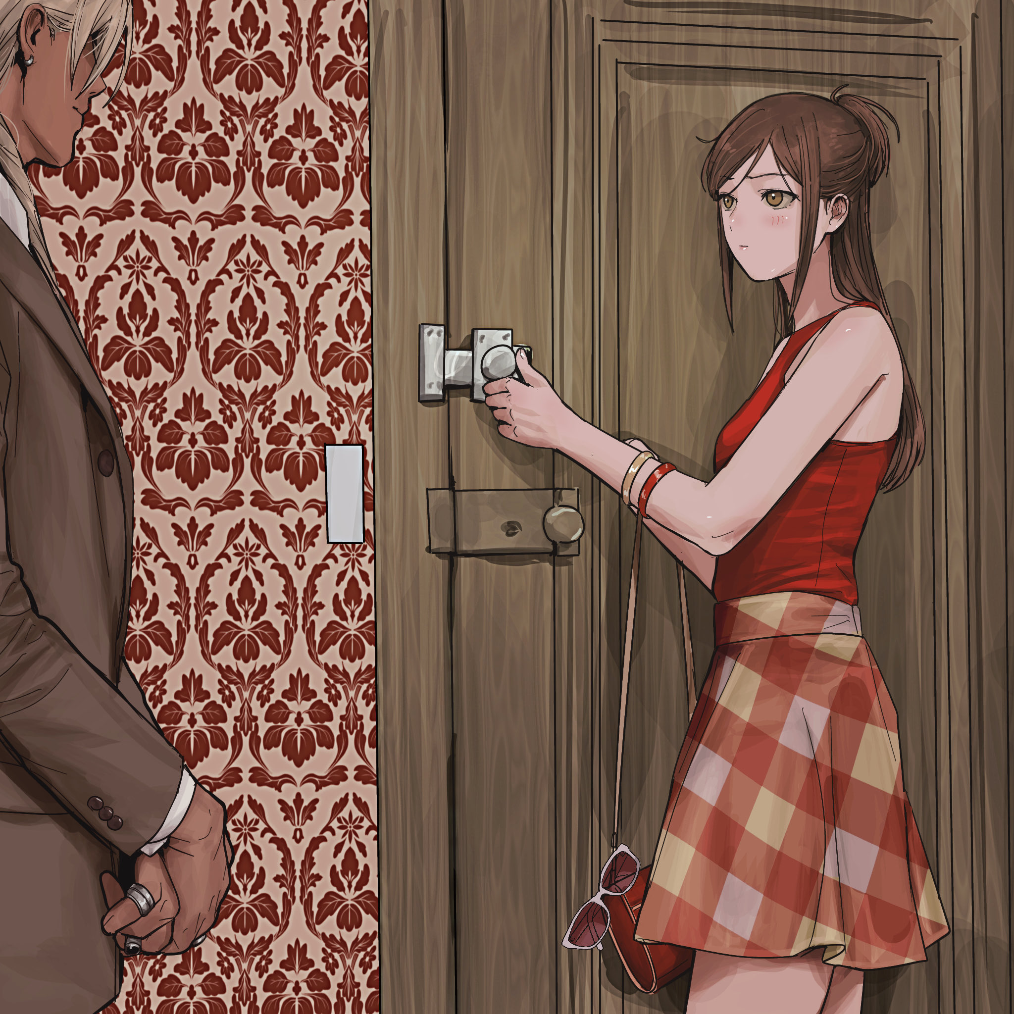 1boy 1girl ace_attorney amikoiiko bag bare_shoulders breasts brown_eyes brown_hair brown_suit collared_shirt door door_lock ema_skye flower formal_clothes hair_flower hair_ornament half_updo handbag high-waist_skirt highres jewelry klavier_gavin long_hair looking_at_another necktie red_tank_top ring shirt sidelocks skirt small_breasts suit sunglasses tank_top white_shirt