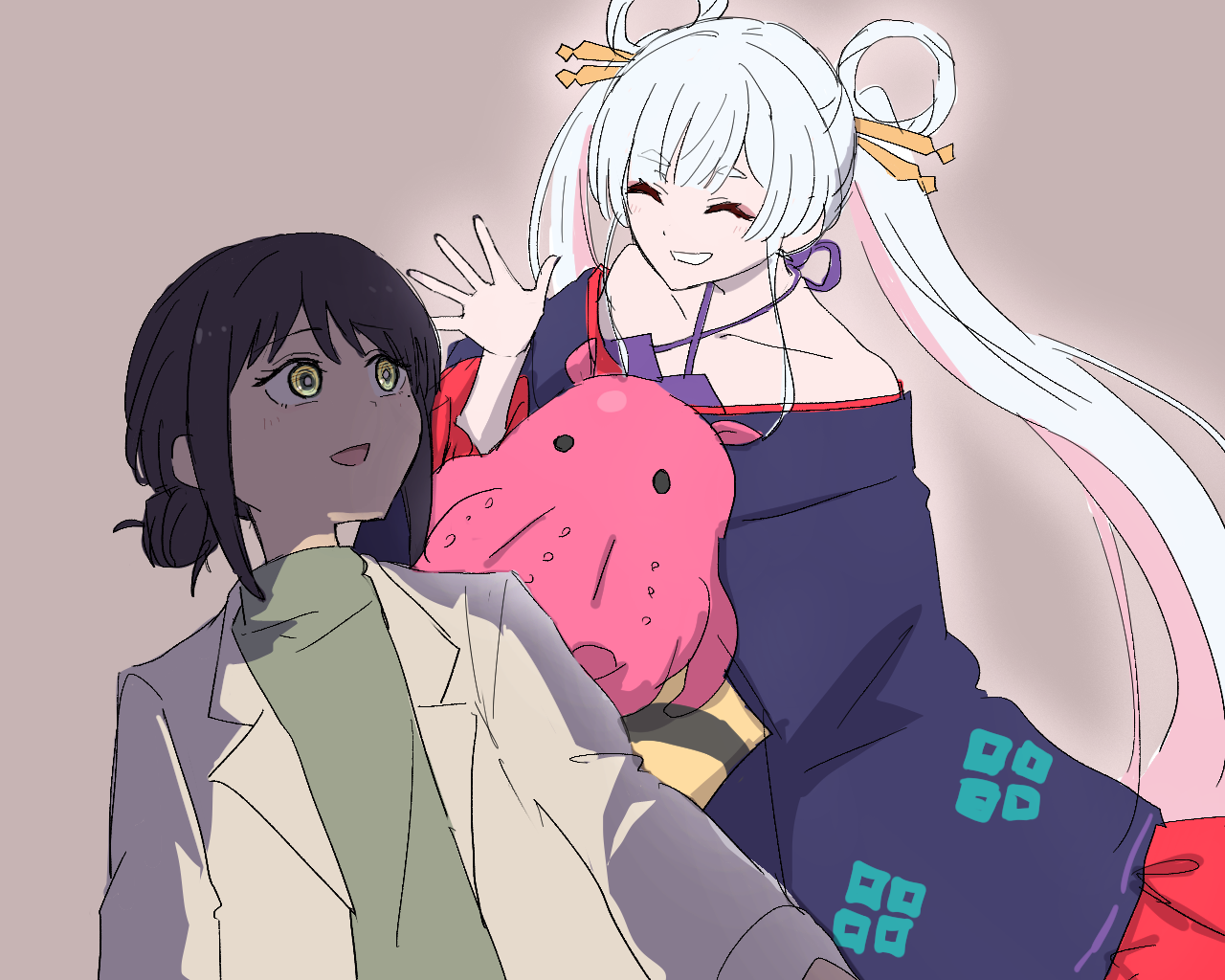 2girls blue_kimono cho_kaguya-hime! colored_inner_hair commentary green_shirt grey_background hair_rings ini_yoy japanese_clothes kimono lab_coat long_hair mole mole_under_eye multicolored_hair multiple_girls off_shoulder open_mouth pink_hair runami_yachiyo sakayori_iroha shirt simple_background twintails waving white_hair yellow_eyes