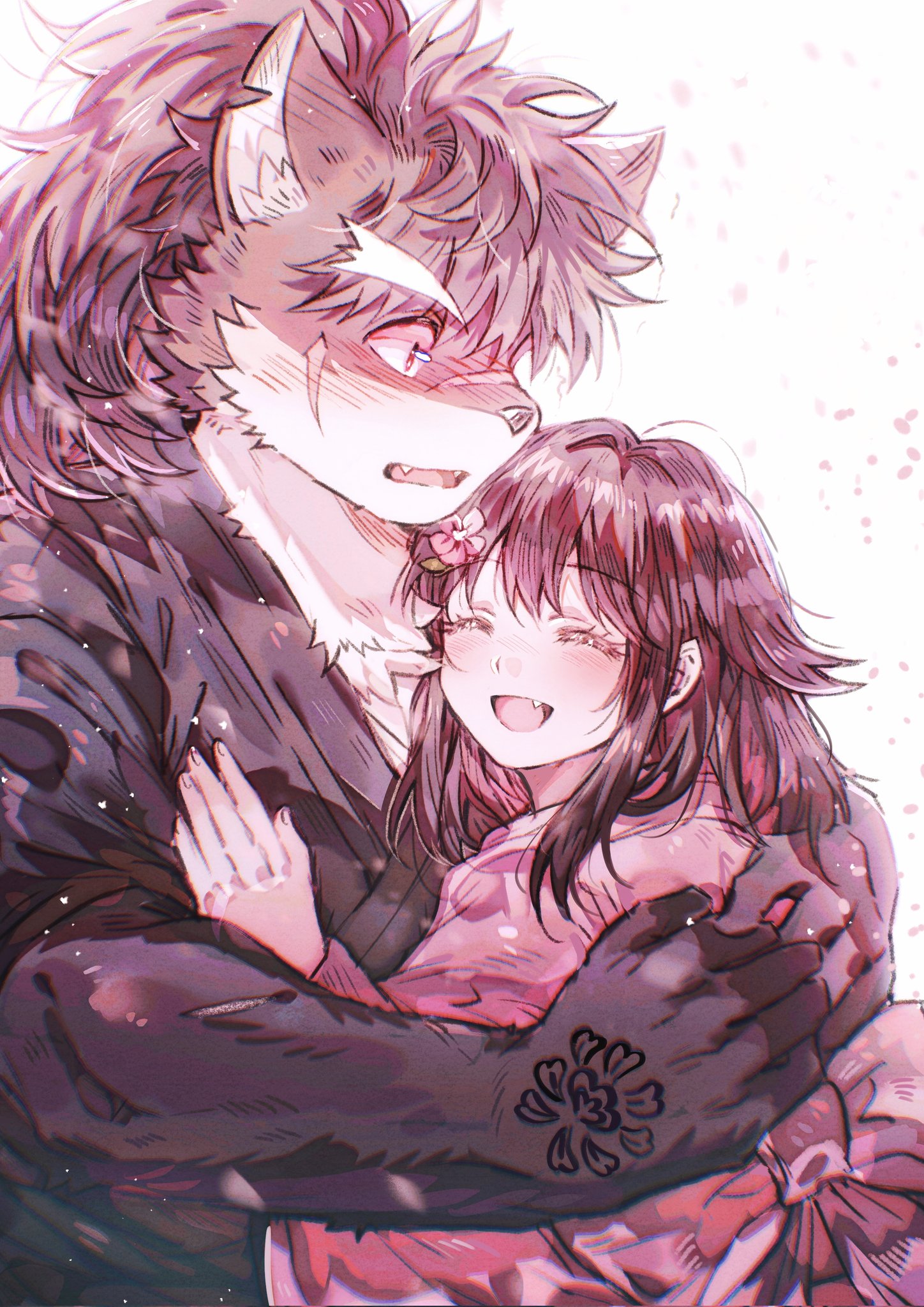 1boy 1girl animal_ears blush closed_eyes commentary couple dog_boy dog_ears english_commentary facial_scar floral_print flower flower_on_head furry furry_male fusehime_(housamo) highres hug japanese_clothes kimono open_mouth peony_print s3zwrtdyqaewnci scar scar_on_cheek scar_on_face scar_on_nose shino_(housamo) smile tokyo_houkago_summoners