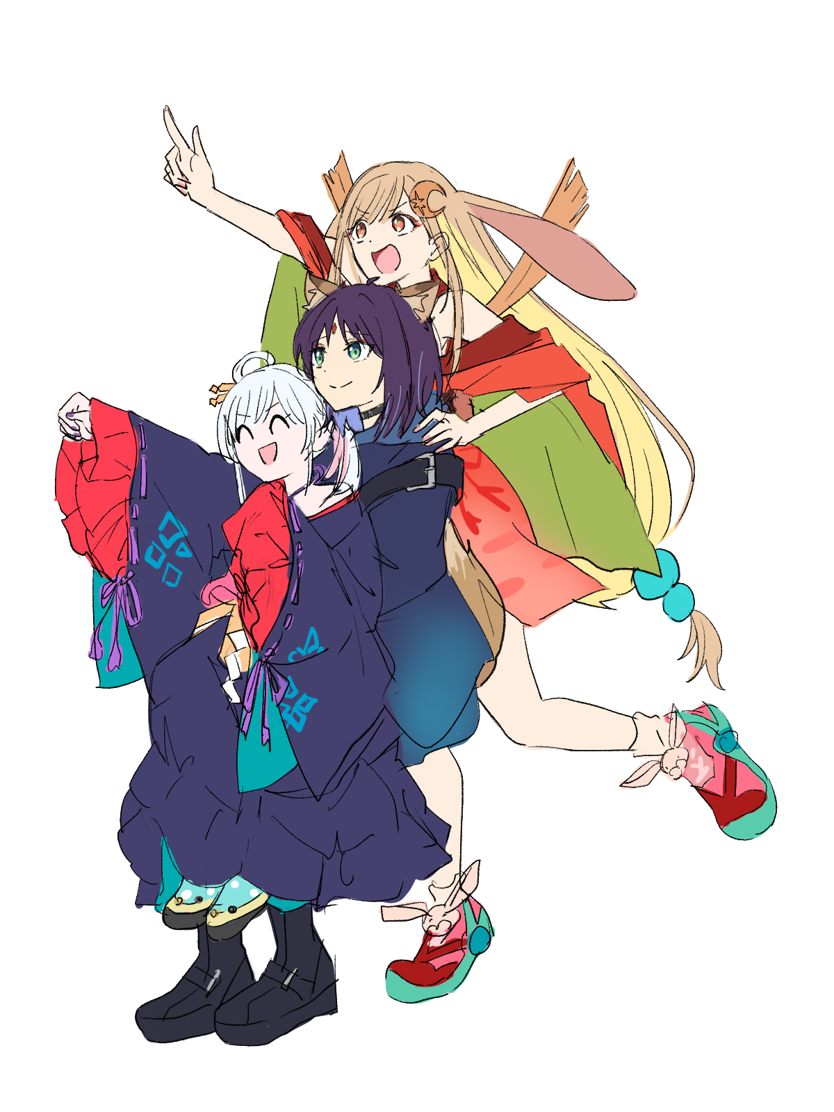 3girls ^_^ animal_ears black_choker blue_hair blue_kimono brown_eyes cho_kaguya-hime! choker closed_eyes commentary crescent crescent_hair_ornament fox_ears fox_girl fox_tail green_eyes hair_ornament highres indoors ini_yoy japanese_clothes kaguya_(cho_kaguya-hime!) kimono multiple_girls open_mouth rabbit_ears rabbit_girl red_kimono runami_yachiyo sakayori_iroha simple_background tail twintails white_background