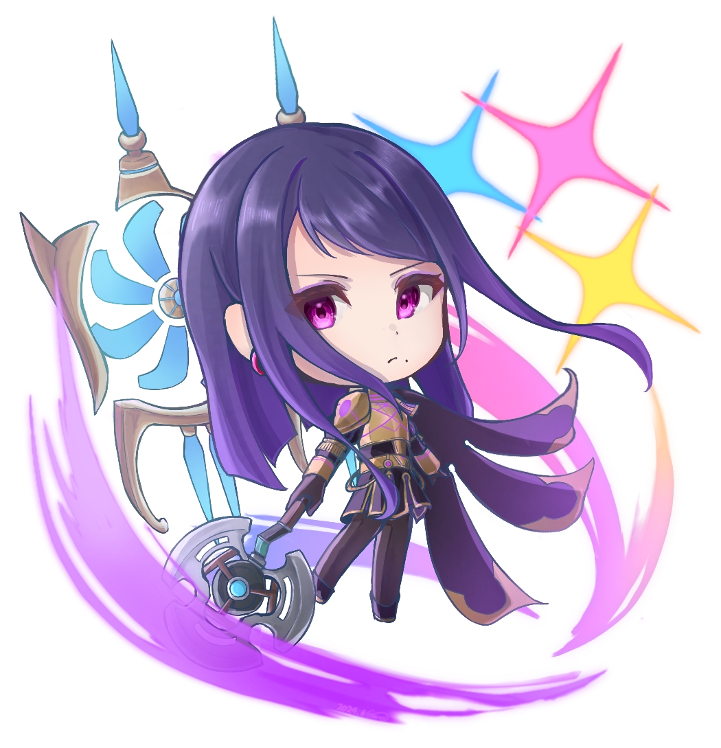 1girl axe battle_axe chibi chibi_only commentary_request earrings edelgard_von_hresvelg emblem_(fire_emblem_engage) expressionless fire_emblem fire_emblem:_three_houses fire_emblem_engage frown gloves holding holding_axe holding_weapon intelligent_systems ivy_(fire_emblem) jewelry long_hair looking_to_the_side nintendo official_alternate_costume official_alternate_hairstyle possessed possession purple_eyes purple_hair shi-on simple_background single_earring solo sparkle weapon white_background wings