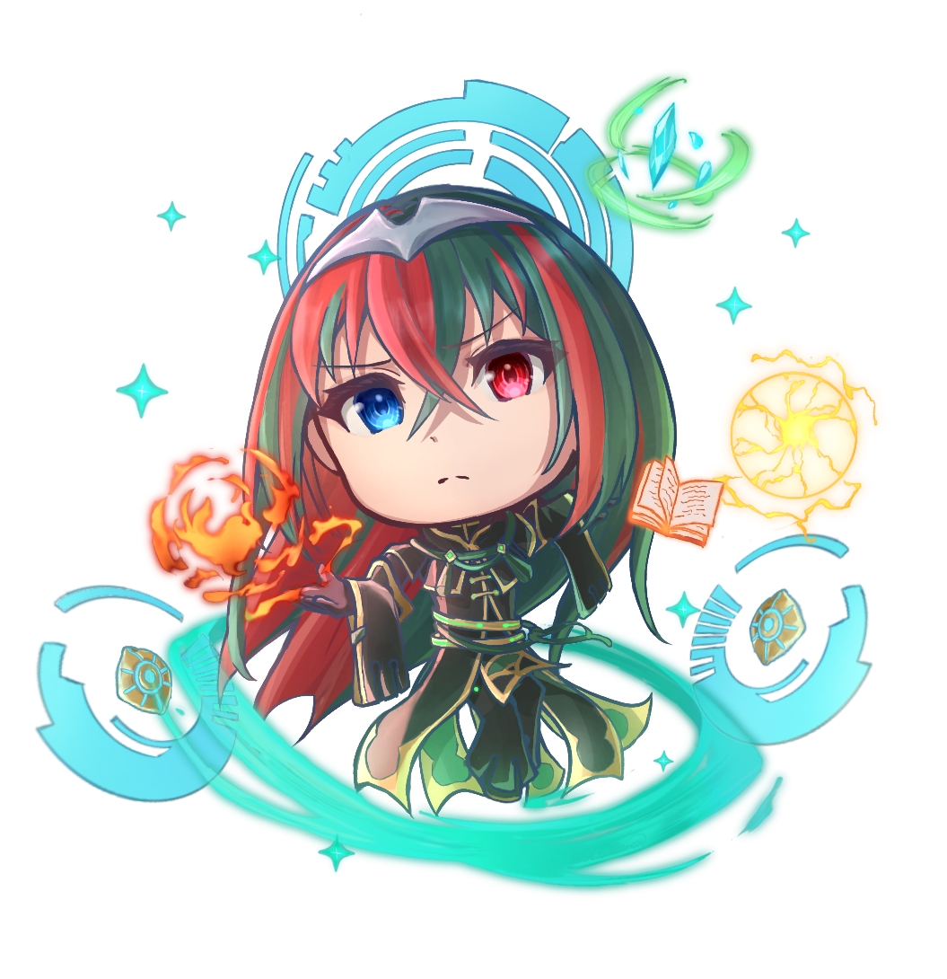 1girl aura blue_eyes book chibi chibi_only commentary_request crystal electricity emblem_(fire_emblem_engage) expressionless female_alear_(fire_emblem) fire fire_emblem fire_emblem:_path_of_radiance fire_emblem_engage floating frown gloves green_hair heterochromia intelligent_systems looking_at_viewer magic multicolored_hair nintendo possessed possession red_eyes red_hair shi-on simple_background solo soren_(fire_emblem) sparkle weapon white_background