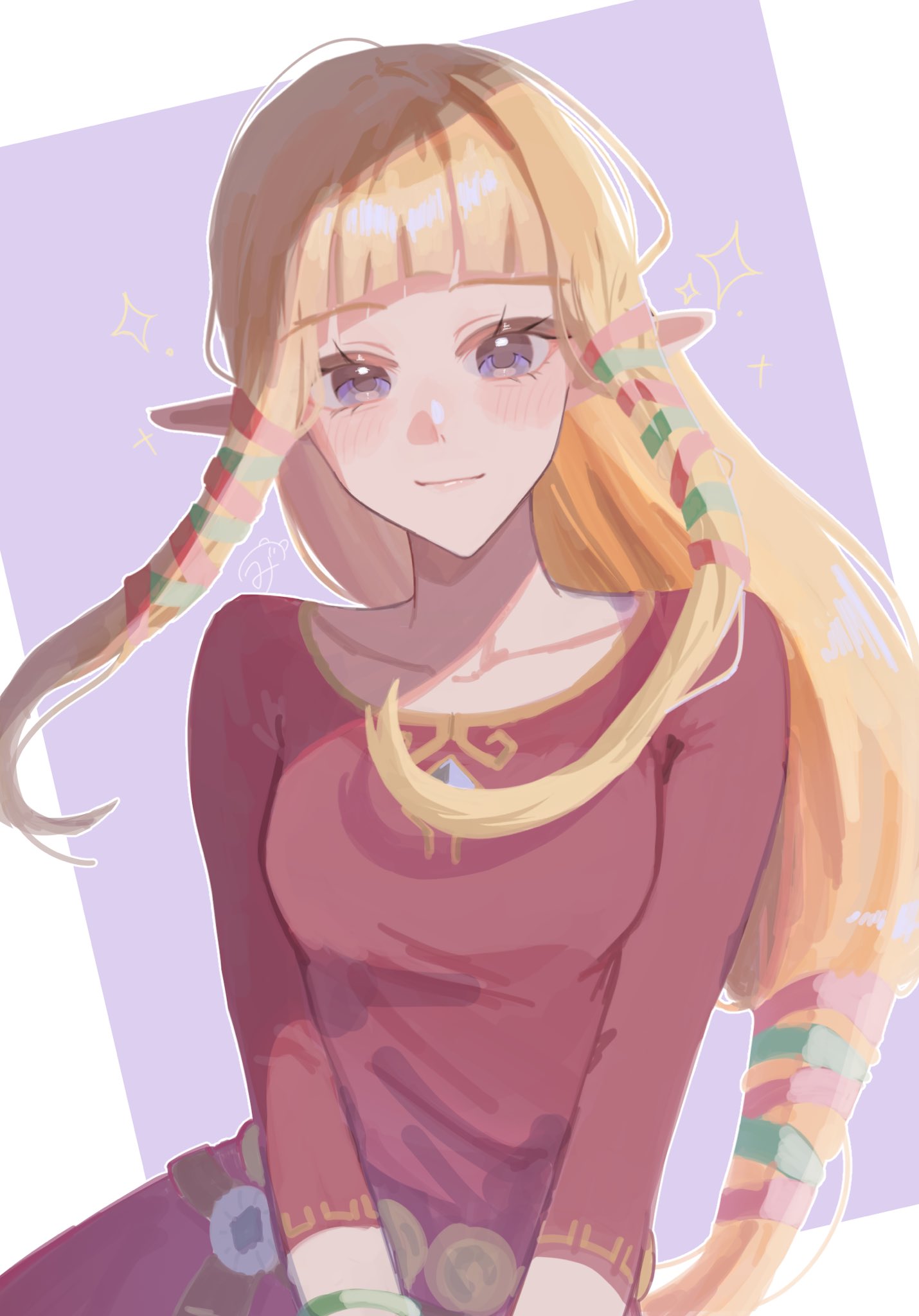 1girl blonde_hair blue_eyes blush breasts closed_mouth collarbone commentary dress hair_ornament hair_ribbon highres long_hair long_sleeves looking_at_viewer mikuma0907 nintendo pink_dress pointy_ears princess_zelda red_dress ribbon sidelocks smile solo the_legend_of_zelda the_legend_of_zelda:_skyward_sword untranslatable_commentary
