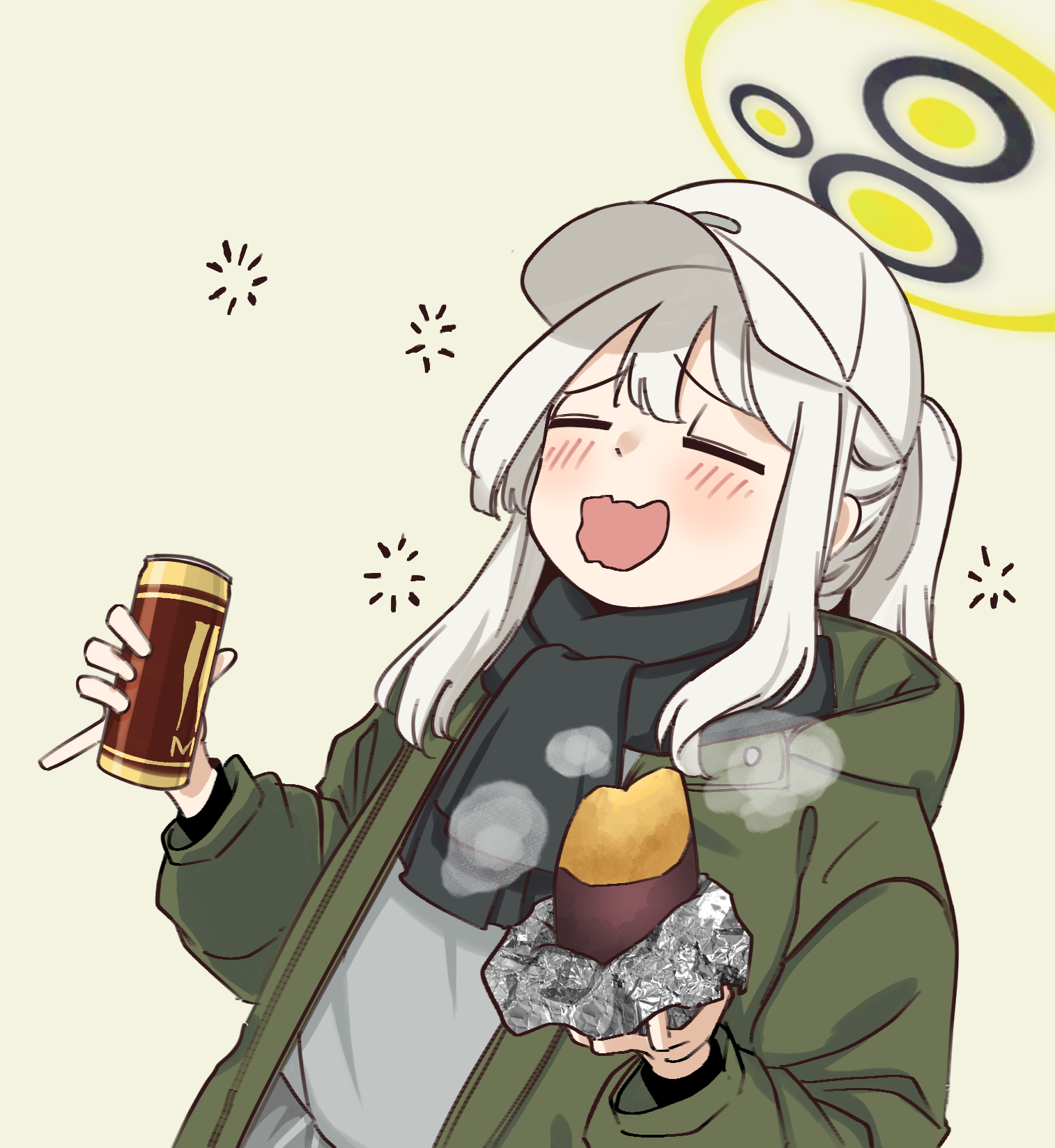 1girl =_= baseball_cap black_scarf blue_archive blush can chinese_commentary closed_eyes coat commentary_request dual_wielding energy_drink food furrowed_brow green_coat hair_between_eyes halo hands_up happy hare_(blue_archive) hare_(camp)_(blue_archive) hat highres holding holding_can holding_food hood hooded_coat long_sleeves monster_energy official_alternate_costume open_clothes open_coat open_mouth pinky_out ponytail roasted_sweet_potato scarf sidelocks simple_background smile solo steam sweet_potato upper_body wavy_mouth white_hat yellow_background yellow_halo zombt