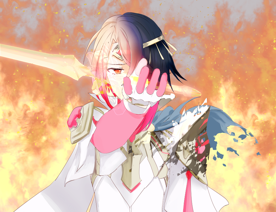 1boy alfred_(fire_emblem) alternate_costume alternate_eye_color cape commentary_request emblem_(fire_emblem_engage) fire fire_emblem fire_emblem:_the_binding_blade fire_emblem_engage gloves hair_over_one_eye holding holding_sword holding_weapon intelligent_systems male_focus nintendo possessed possession reaching reaching_for_weapon reaching_towards_viewer red_eyes red_hair roy_(fire_emblem) shoochiku_bai solo sword tiara torn_cape torn_clothes transformation weapon