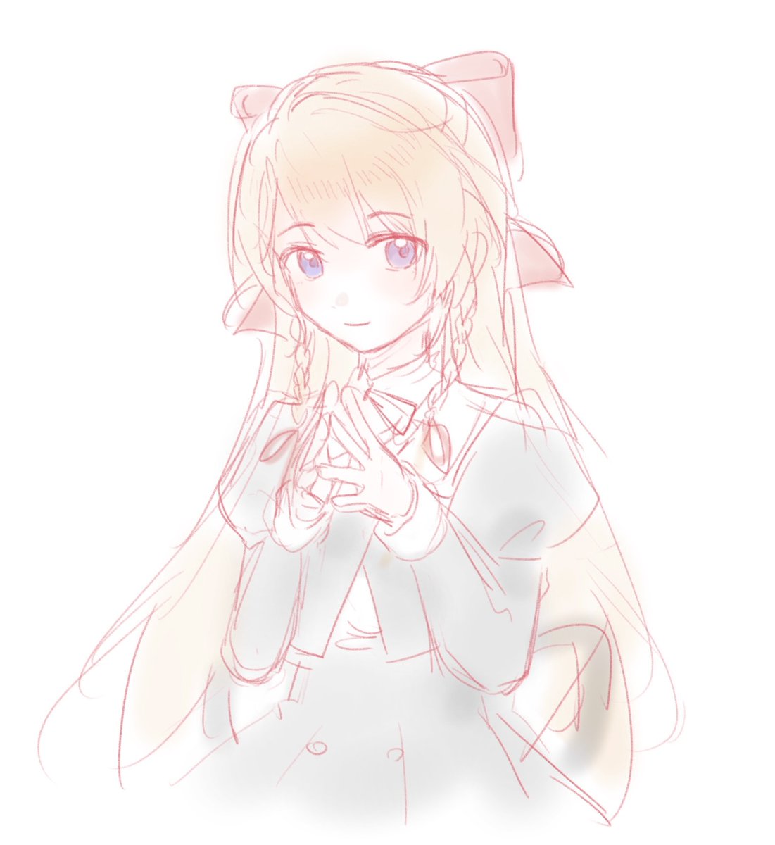 1girl antares_(alxy13d) assault_lily black_skirt blue_eyes blush bow braid braided_sidelocks brown_hair buttons chinese_commentary closed_mouth commentary_request cropped_jacket hair_bow hands_up high-waist_skirt highres juliet_sleeves light_smile long_hair long_sleeves looking_at_viewer low-tied_sidelocks monica_rossi own_hands_together puffy_sleeves red_bow school_uniform shirt sidelocks simple_background sketch skirt solo standing steepled_fingers twin_braids upper_body very_long_hair white_background white_shirt yurigaoka_girls_academy_school_uniform