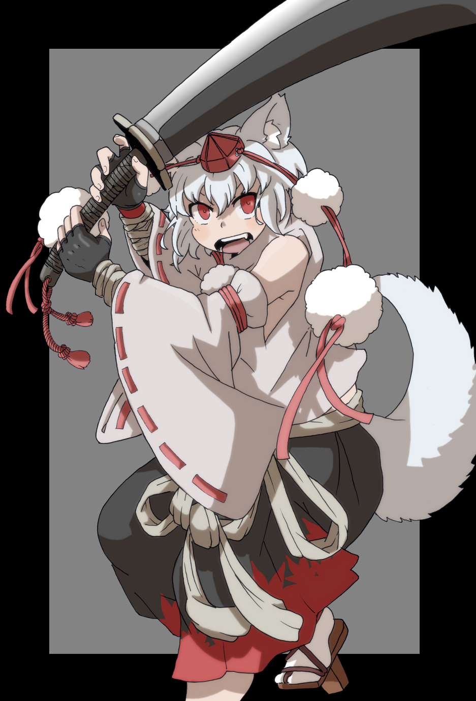 1girl animal_ear_fluff animal_ears arutarufu bare_shoulders black_gloves commentary_request detached_sleeves fingerless_gloves gloves hat highres holding holding_sword holding_weapon inubashiri_momiji japanese_clothes looking_to_the_side ootachi open_mouth pom_pom_(clothes) red_eyes shirt solo sword tail tassel tokin_hat touhou weapon white_hair wolf_ears wolf_tail