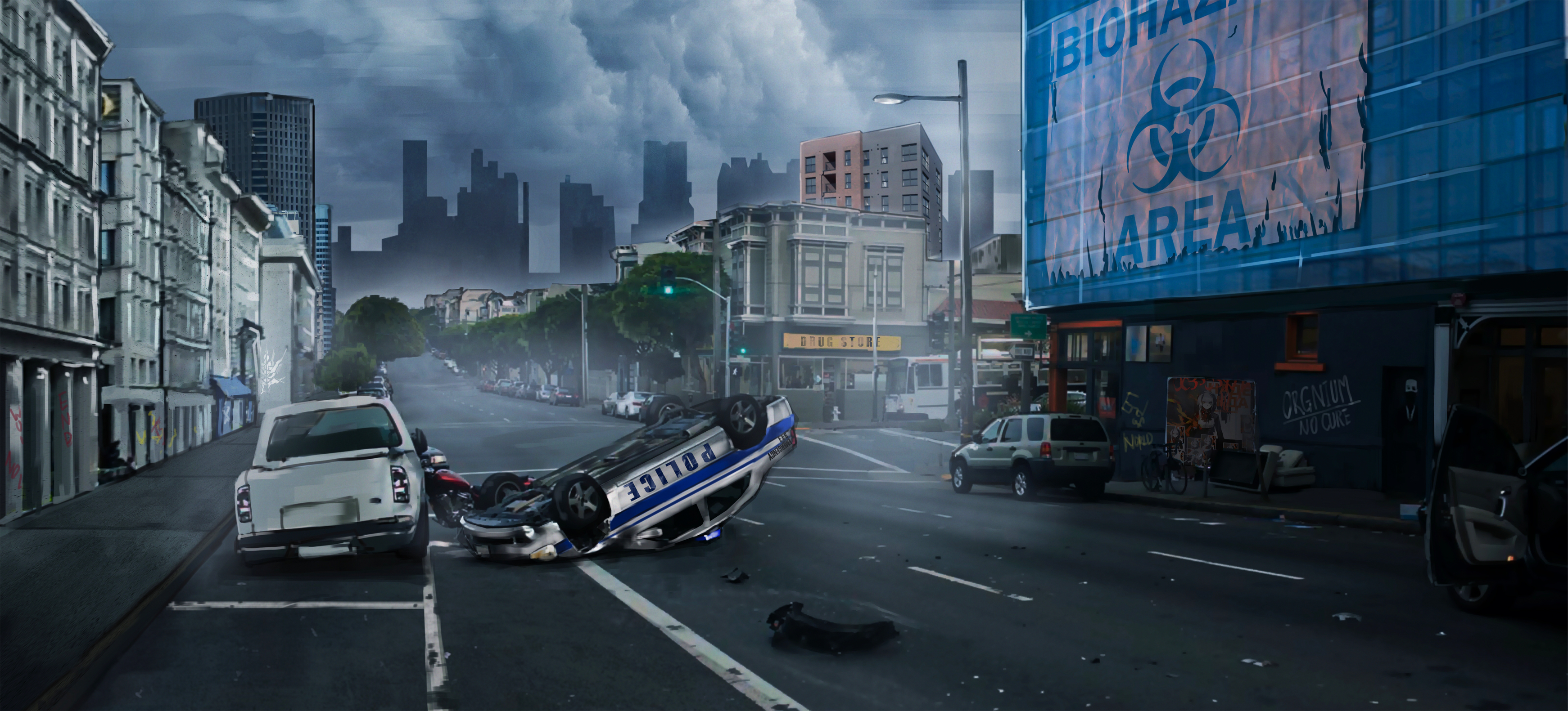 absurdres amgn_(kig043030) arknights billboard bridge building bus car city cityscape cloud cloudy_sky crosswalk english_text highres lamppost motor_vehicle no_humans outdoors police_car rain road scenery sign sky skyscraper street tree truck van yan_logo