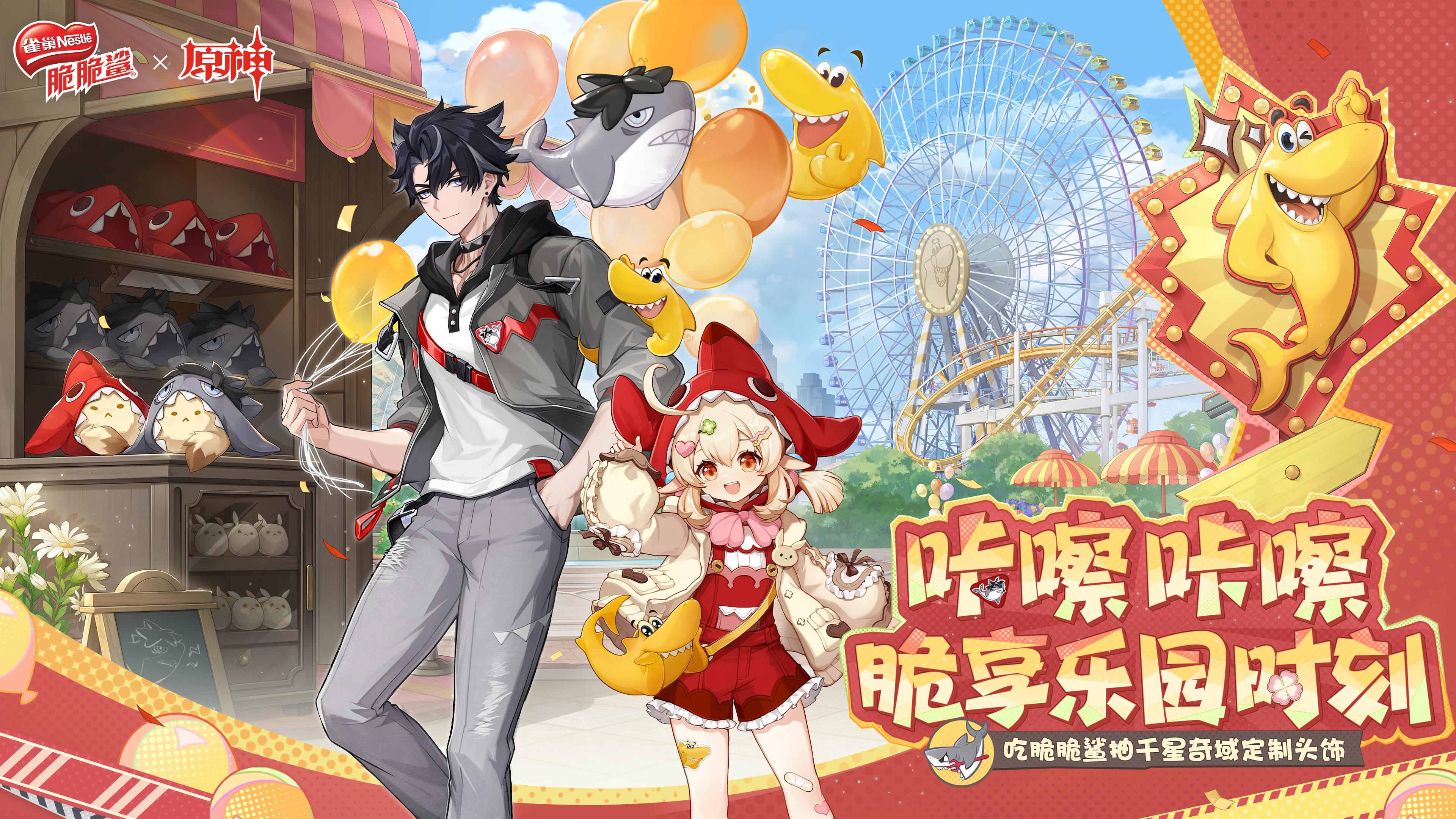 1boy 1girl absurdres amusement_park animal_hat balloon bandaid bandaid_on_leg black_choker black_hair blonde_hair brown_jacket choker closed_mouth commentary_request dress ferris_wheel genshin_impact grey_hair grey_jacket grey_pants hair_between_eyes hand_in_pocket hat highres holding holding_balloon jacket klee_(genshin_impact) long_sleeves multicolored_hair nestle official_alternate_costume official_art open_mouth orange_eyes outdoors pants pointy_ears red_dress red_hat shark shark_hat shirt short_hair streaked_hair translation_request white_shirt wriothesley_(genshin_impact)