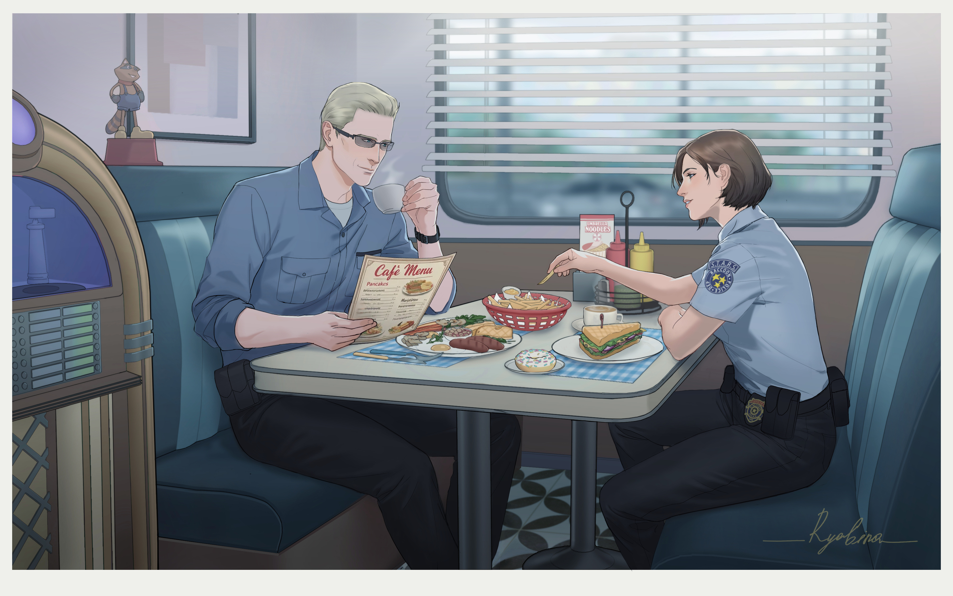 1boy 1girl absurdres albert_wesker alternate_universe arm_on_table artist_name belt black_belt black_pants blonde_hair blue_eyes blue_shirt booth_seating border brown_hair closed_mouth coffee coffee_mug collared_shirt cup day dimple diner donut figure food french_fries fried_egg from_side highres holding holding_cup holding_food holding_menu indoors jill_valentine jukebox ketchup_bottle looking_at_another menu mr._raccoon_(resident_evil) mug mustard_bottle pants parted_lips police police_badge police_uniform resident_evil rya6ina sandwich sausage shirt short_hair short_sleeves signature sitting sleeves_rolled_up smile steam sunglasses table white_border window window_blinds
