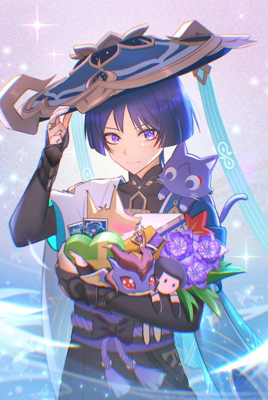 1boy blue_eyes blue_hair card closed_mouth commentary durin_(genshin_impact) english_commentary flower genshin_impact hand_on_headwear highres holding kuro_tsubasa looking_at_viewer male_focus mini_durin_(genshin_impact) scaramouche_(cat)_(genshin_impact) scaramouche_(genshin_impact) short_sleeves stuffed_toy wanderer_(genshin_impact) watermark