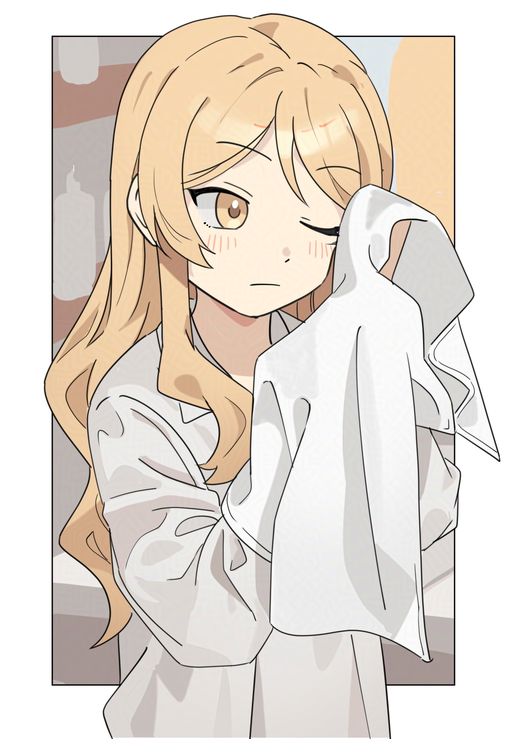 1girl asuka_shirou blonde_hair blush closed_mouth collared_shirt commentary expressionless highres holding holding_towel kirisame_marisa long_hair long_sleeves one_eye_closed shirt solo swept_bangs touhou towel white_shirt yellow_eyes