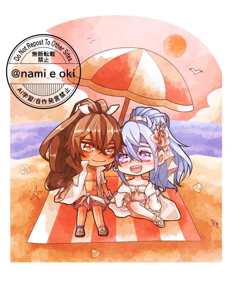 1boy 1girl alternate_costume beach brown_hair closed_mouth commentary_request couple grey_hair hetero kaguya_(rune_factory) nami_e_oki open_mouth orange_eyes purple_eyes rune_factory rune_factory:_guardians_of_azuma smile subaru_(rune_factory)