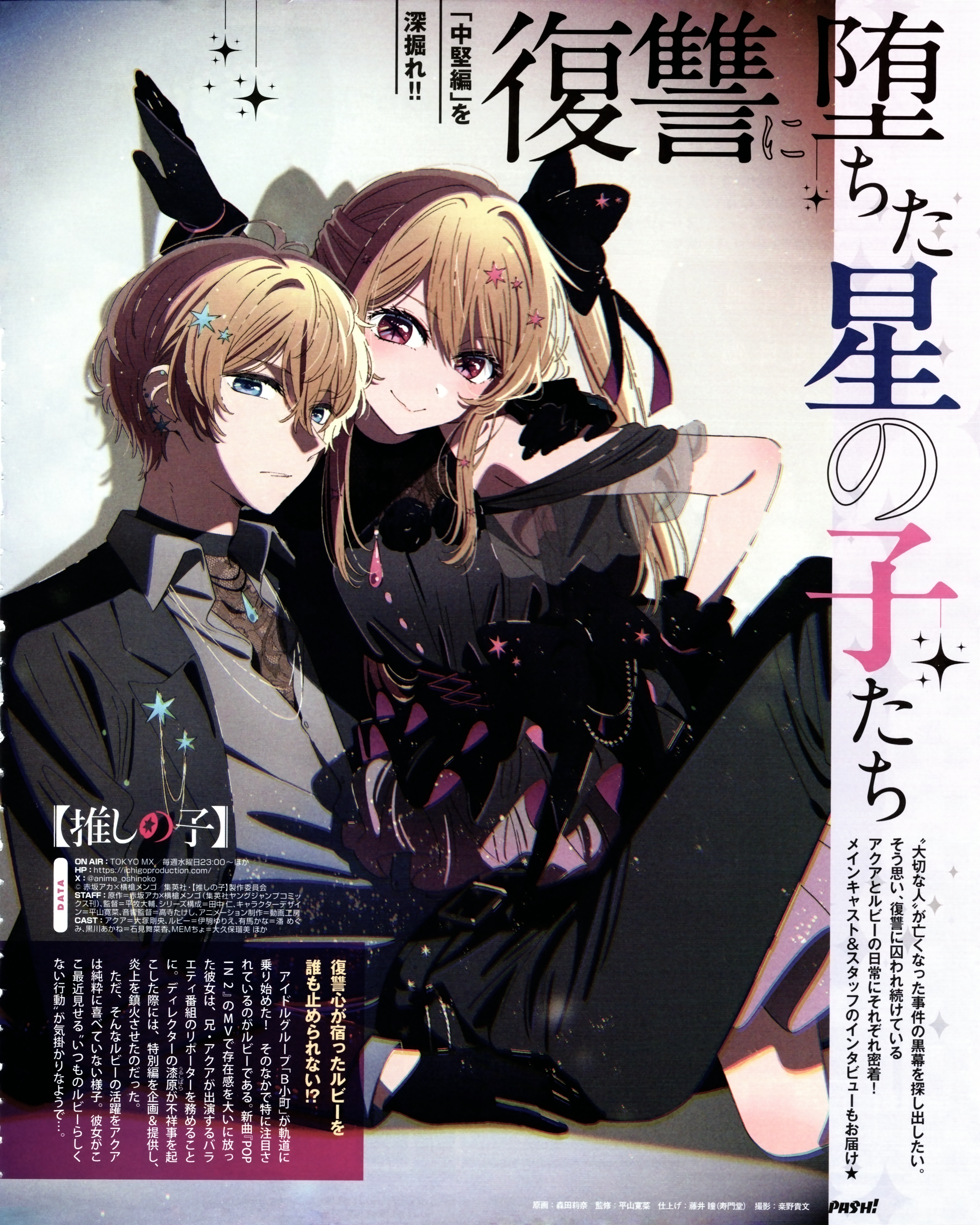 1boy 1girl absurdres artist_request black_bow black_dress black_gloves black_suit bleed_through blonde_hair blue_eyes bow closed_mouth copyright_name copyright_notice dress formal_clothes gloves hair_between_eyes hair_bow highres hoshino_aquamarine hoshino_ruby long_hair looking_at_viewer magazine_scan official_art one_side_up oshi_no_ko pink_eyes scan scan_artifacts serious shadow short_hair siblings sidelocks smile star-shaped_pupils star_(symbol) suit symbol-shaped_pupils third-party_source translation_request twins